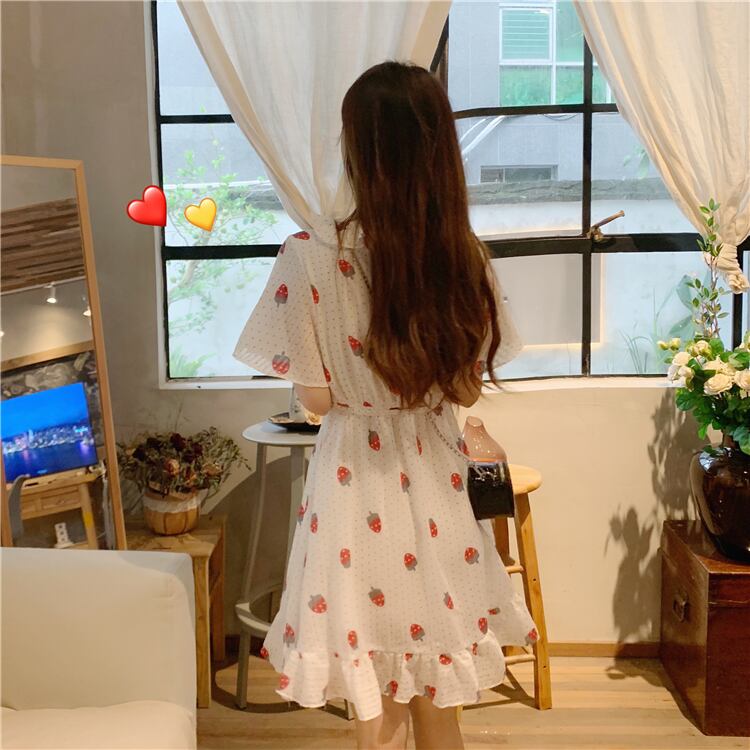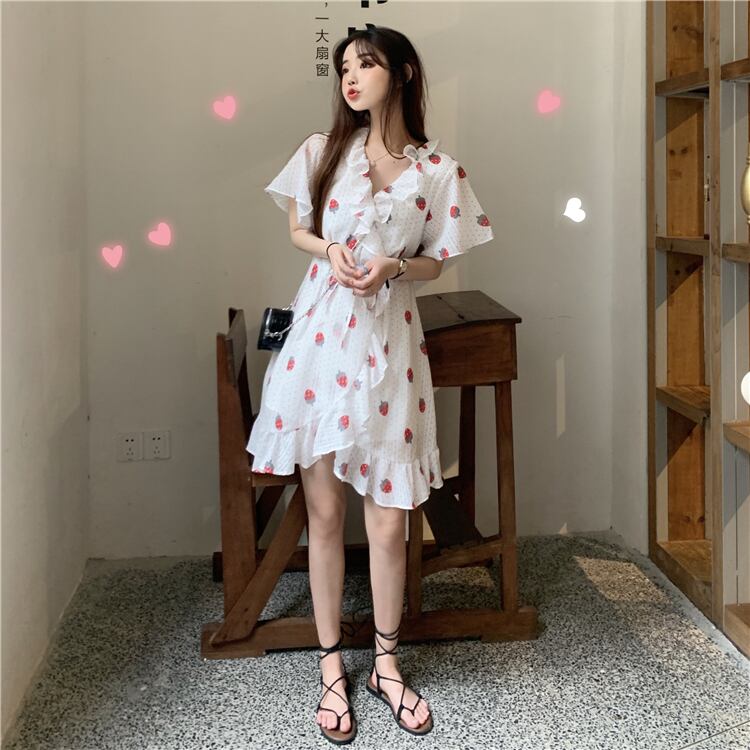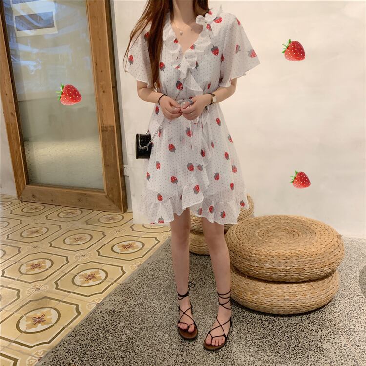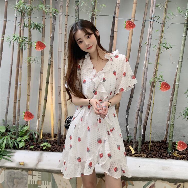 ✞ フリルが可愛い♥定番いちご柄ふんわりシフォン膝丈ワンピース ウエストすっきり☆スウィート キュート カジュアル ✞ゴスロリ SM ミリ 甘ロリ クラロリ 和ロリ エレガント 黒ロリ 姫ロリ 華ロリ BB-BB1307995