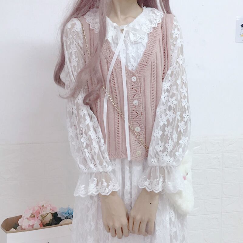 ✞ ニットVネックベストセーター or 総レースふんわりパフスリーブ袖ワンピース ✞ゴスロリ SM ミリ 甘ロリ クラロリ 和ロリ エレガント 黒ロリ 姫ロリ 華ロリ BB-BB2901420