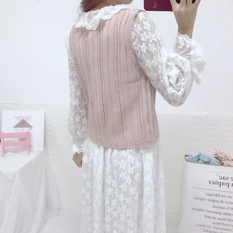 色:白レースワンピ,ピンクのベスト