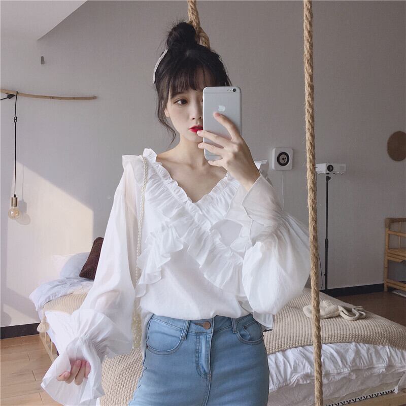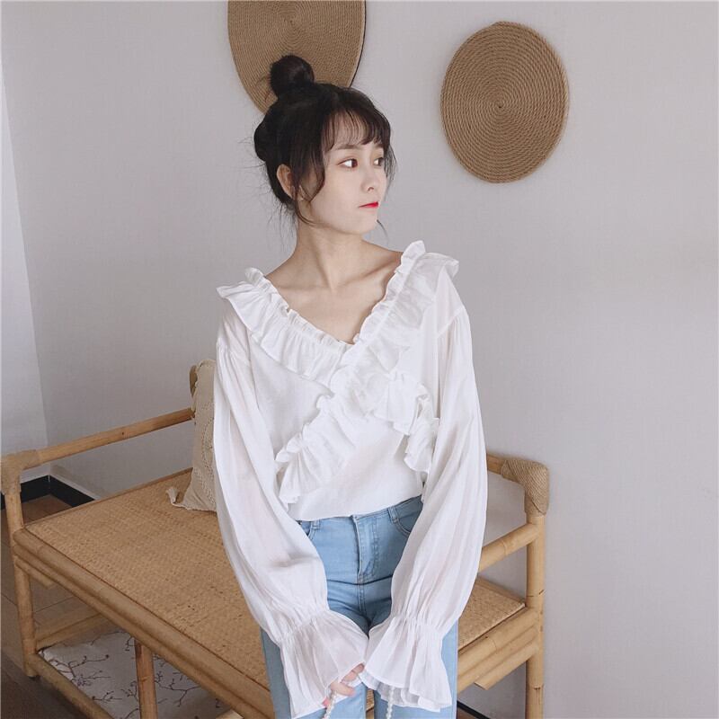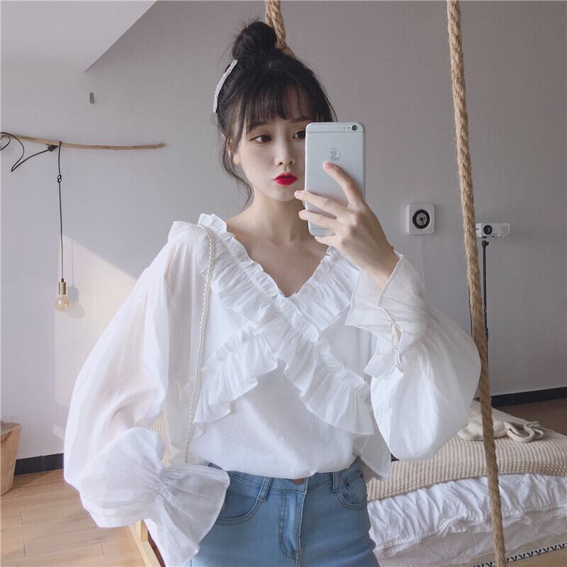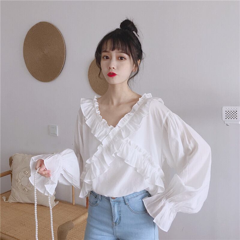 ✞ ♬カワイイ♥Vネック襟元フリルシャツブラウス ベルスリーブ ✞ゴスロリ SM ミリ 甘ロリ クラロリ 和ロリ エレガント 黒ロリ 姫ロリ 華ロリ BB-BB3216162