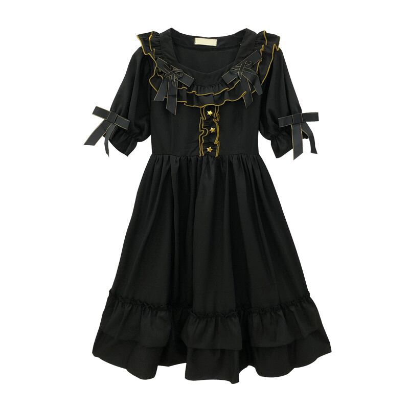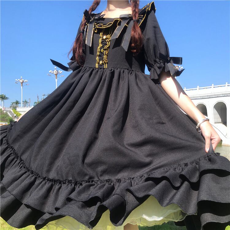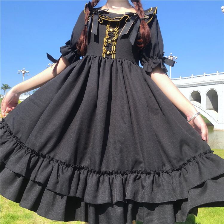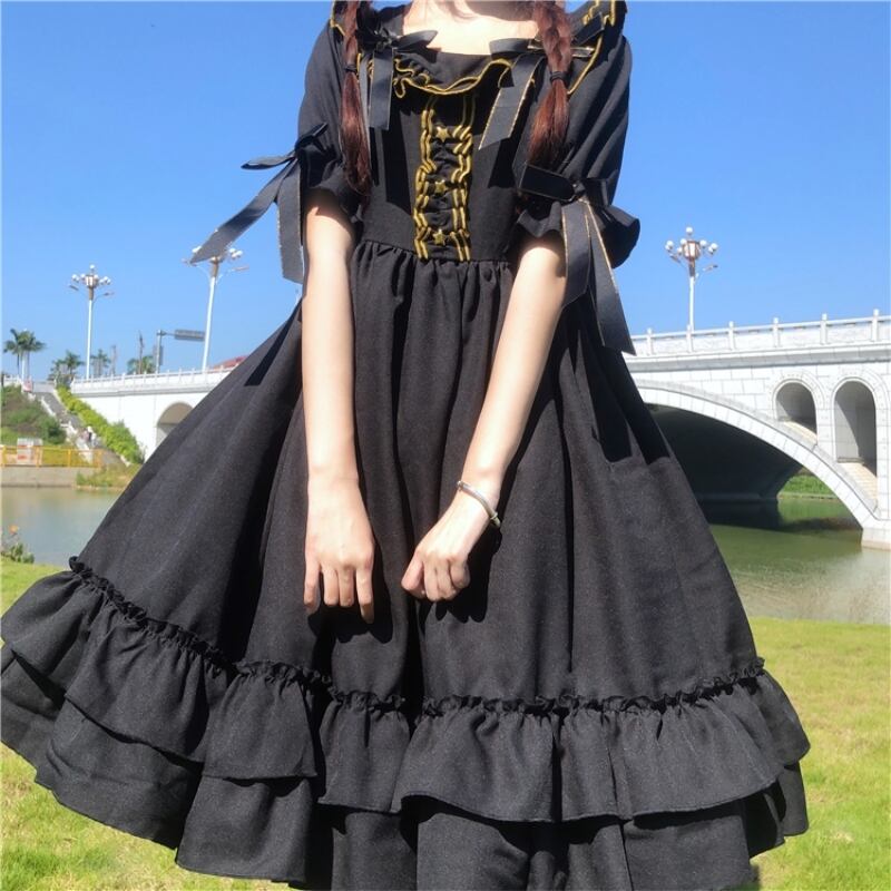✞ ダークなシフォンリボン編み上げフリルワンピース レトロ 夏物 ✞ゴスロリ SM ミリ 甘ロリ クラロリ 和ロリ エレガント 黒ロリ 姫ロリ 華ロリ BB-BB6349755