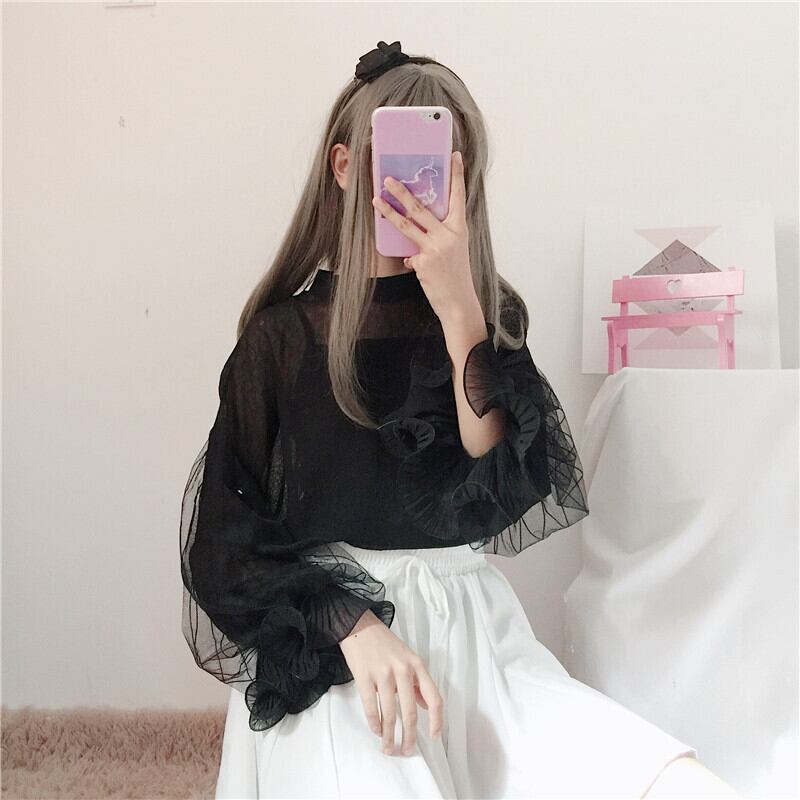 ✞ チュールメッシュパフスリーブシャツブラウス シフォン トップス 大人女子☆ ✞ゴスロリ SM ミリ 甘ロリ クラロリ 和ロリ エレガント 黒ロリ 姫ロリ 華ロリ BB-BB1413094