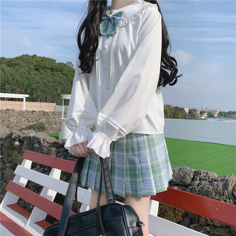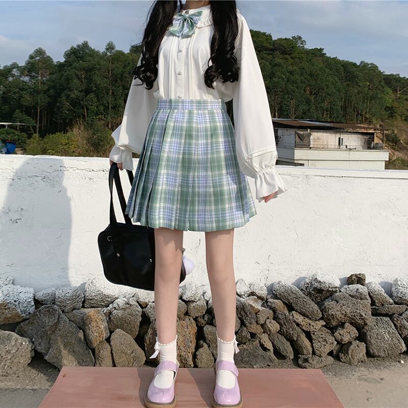 ✞甘めリボンスリーブシャツブラウス or 爽やかAラインチェック柄プリーツスカート 韓国 ランタンスリーブ ✞ゴスロリ SM ミリ 甘ロリ クラロリ 和ロリ エレガント 黒ロリ 姫ロリ 華ロリ BB-BB7758701