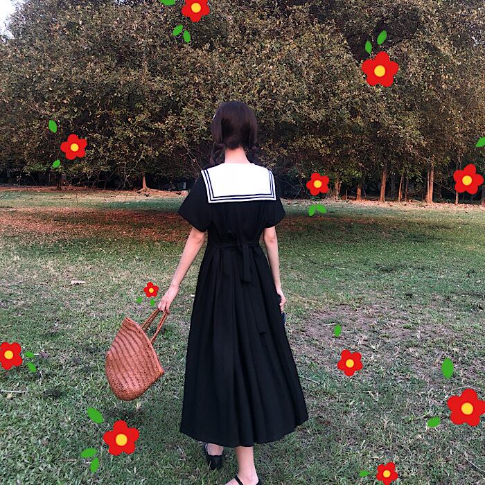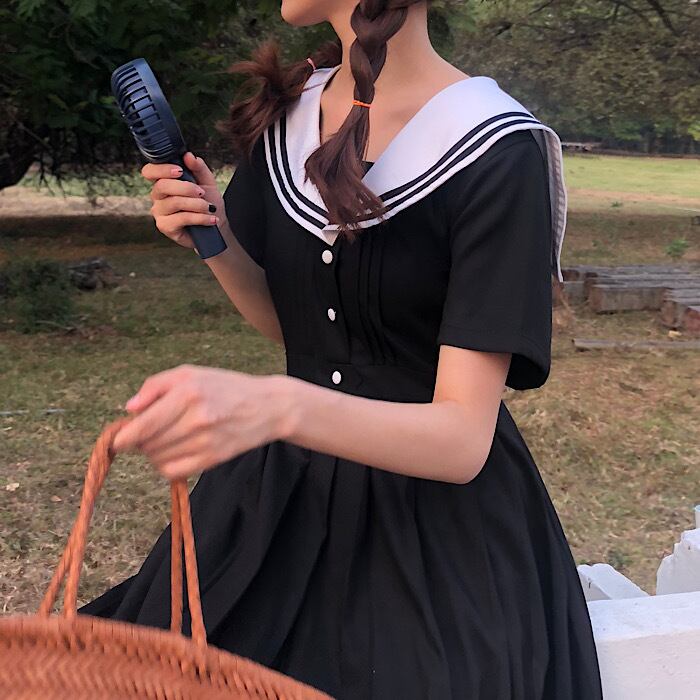 ✞ きれいめ☆制服 ダークブラック半袖スリーブワンピースドレスOP ネイビー プリーツスカート ショート レトロ ハーフスリーブ ステッチ ✞ゴスロリ SM ミリ 甘ロリ クラロリ 和ロリ エレガント 黒ロリ 姫ロリ 華ロリ BB-BB2351137