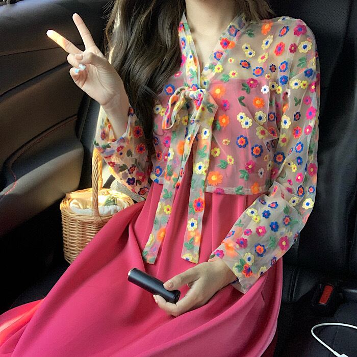 ✞ メッシュ刺繍花柄レース長袖スリーブブラウス ソリッド カラースカート ロング 大人ガーリー スウィート キュート カジュアル ソリッドカラー フラワーデザイン ✞ゴスロリ SM ミリ 甘ロリ クラロリ 和ロリ エレガント 黒ロリ 姫ロリ 華ロリ BB-BB2893589