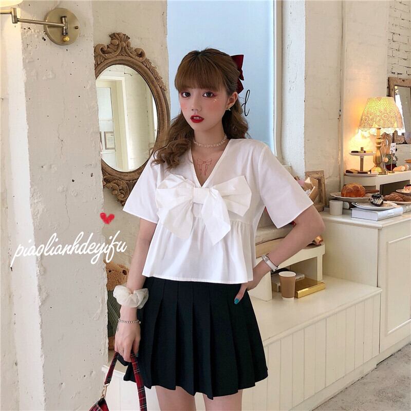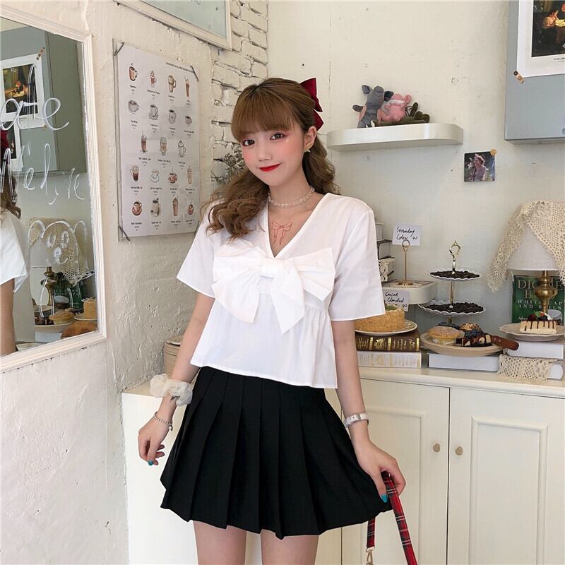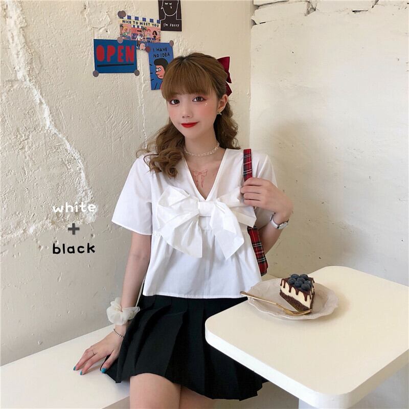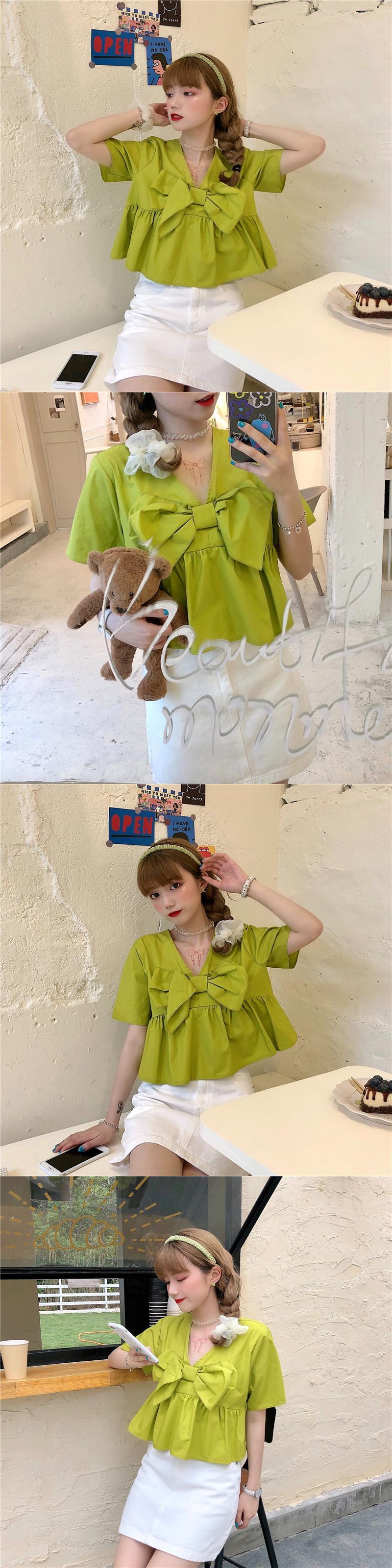 ✞ リボンVネック半袖スリーブソリッド カラーシャツブラウス ショート ハーフスリーブ 大人ガーリー スウィート キュート カジュアル ソリッドカラー ✞ゴスロリ SM ミリ 甘ロリ クラロリ 和ロリ エレガント 黒ロリ 姫ロリ 華ロリ BB-BB2022669
