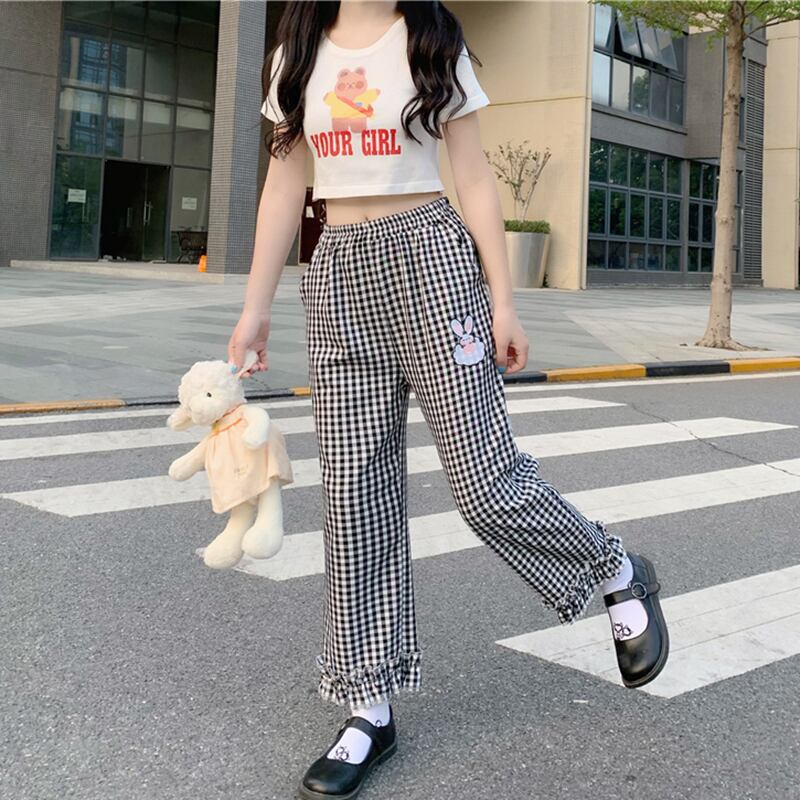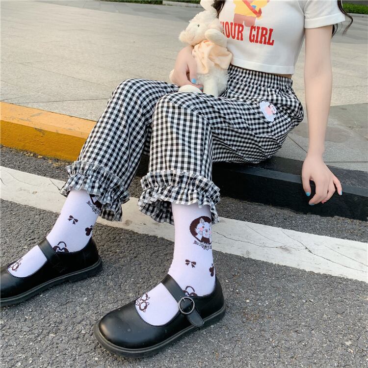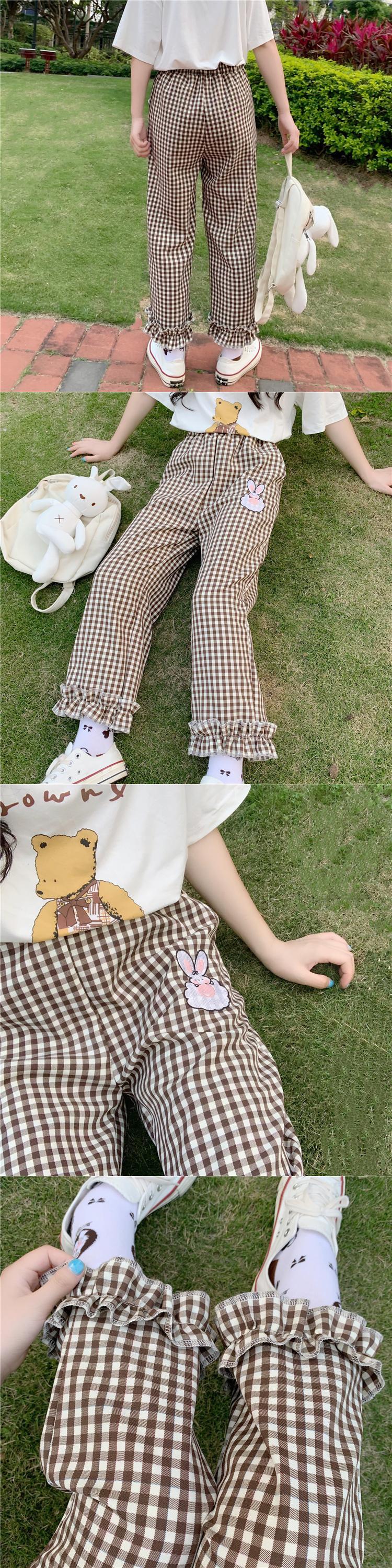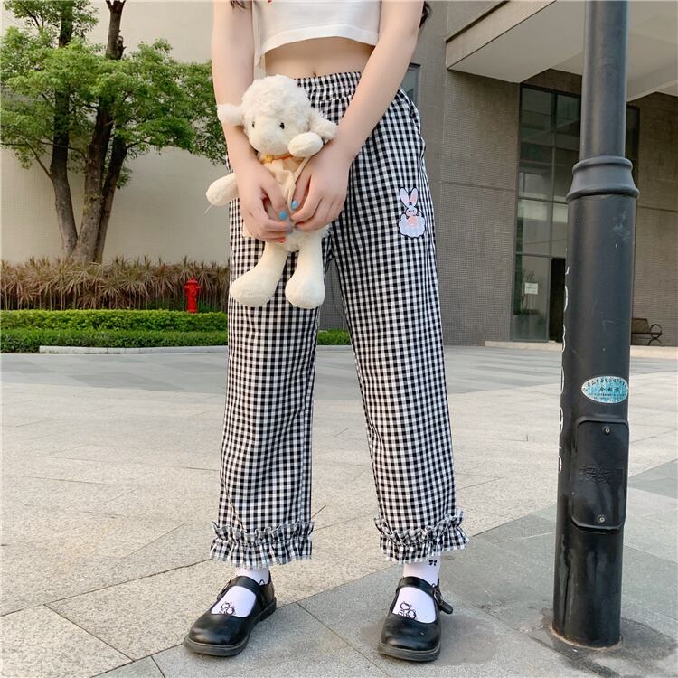 ✞ パンツチェック柄刺繍フリルストレッチ♬カワイイ♥クロップド エラスティック 伸縮 大人ガーリー スウィート キュート カジュアル ✞ゴスロリ SM ミリ 甘ロリ クラロリ 和ロリ エレガント 黒ロリ 姫ロリ 華ロリ BB-BB2789295