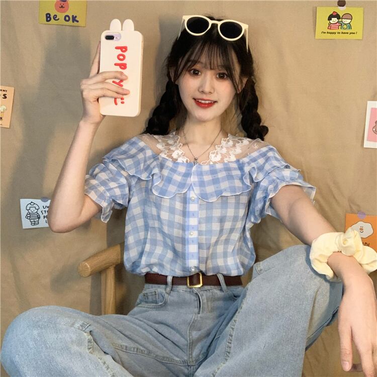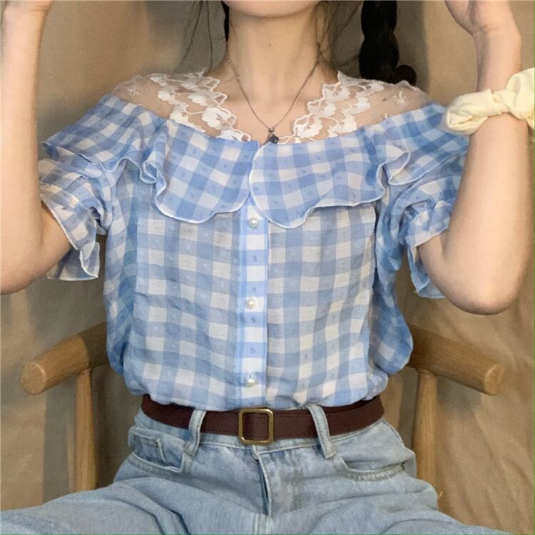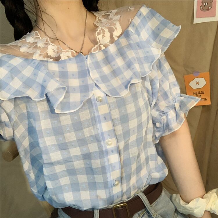 ✞ シャツブラウスチェック柄パールバックルストラップレス半袖スリーブトップス ショート ハーフスリーブ 大人ガーリー スウィート キュート カジュアル 真珠 ✞ゴスロリ SM ミリ 甘ロリ クラロリ 和ロリ エレガント 黒ロリ 姫ロリ 華ロリ BB-BB4115243