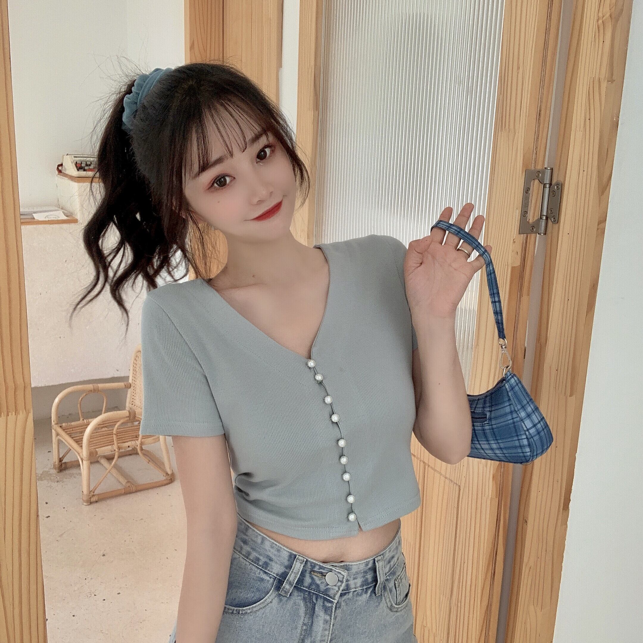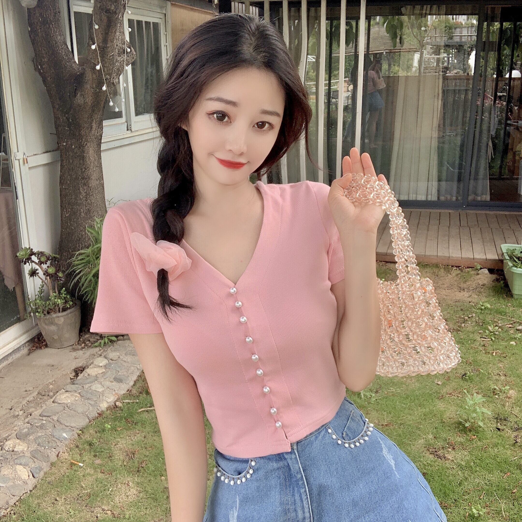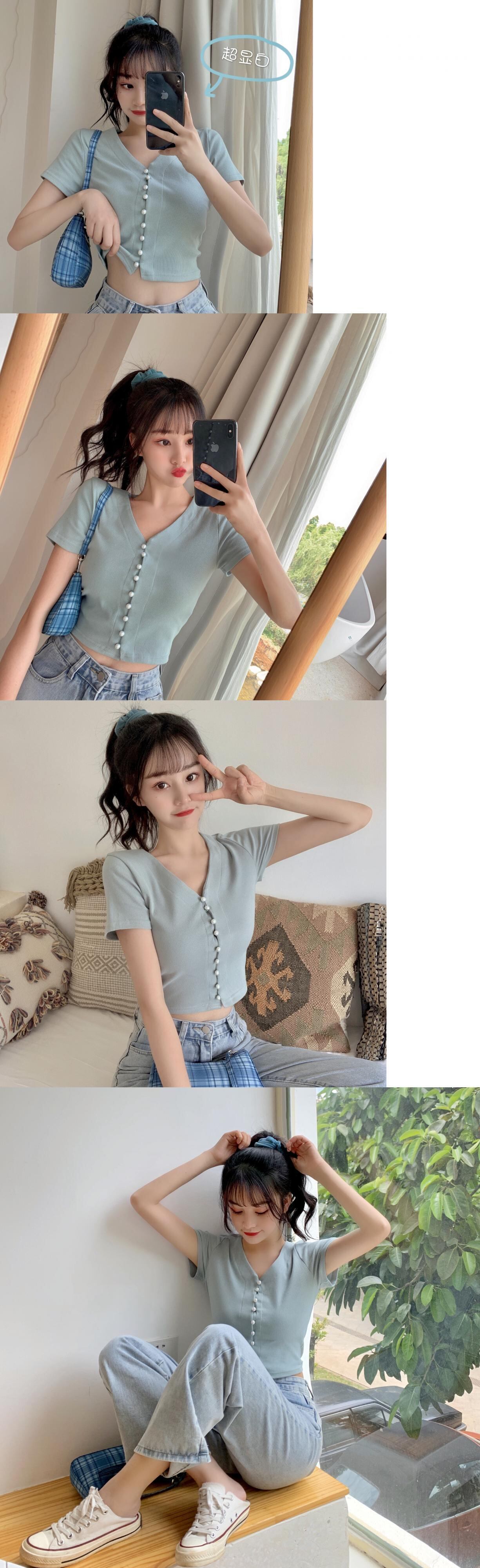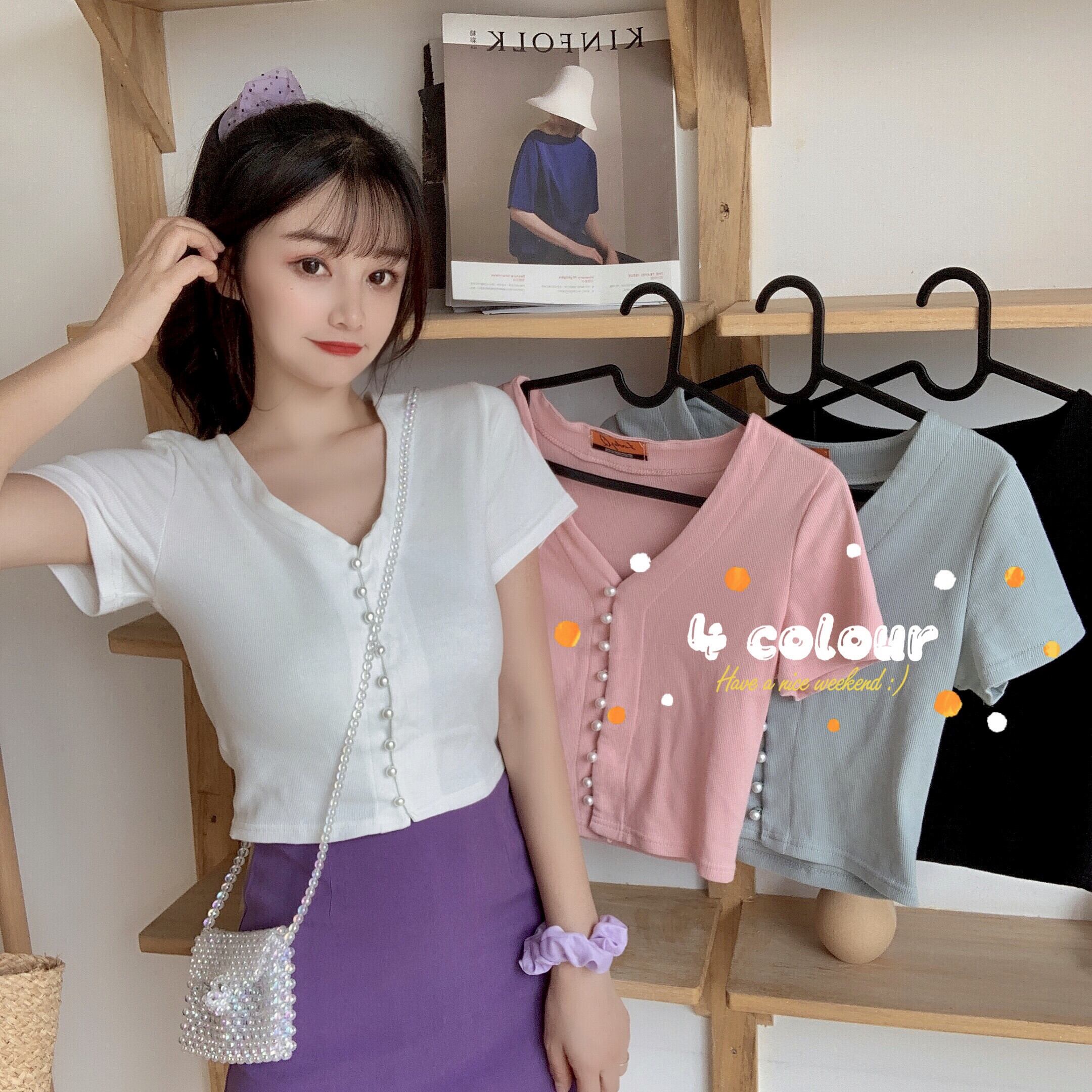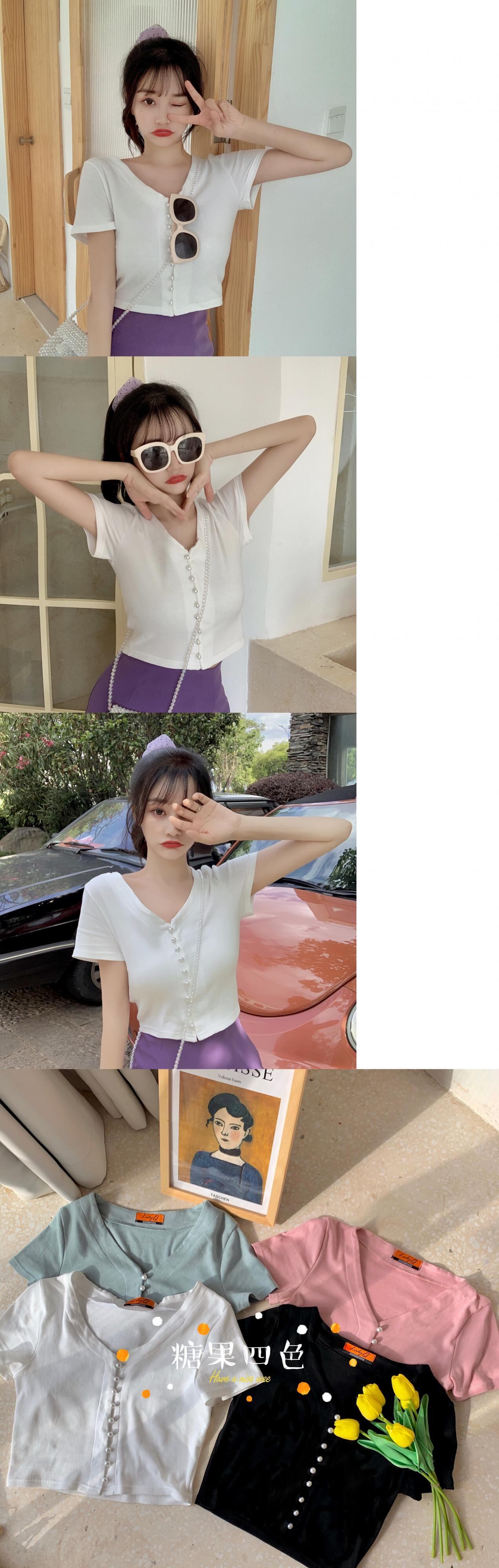 ✞ ショートTシャツ Vネックパールブレスト♬カワイイ♥トップス 大人ガーリー スウィート キュート カジュアル 真珠 ✞ゴスロリ SM ミリ 甘ロリ クラロリ 和ロリ エレガント 黒ロリ 姫ロリ 華ロリ BB-BB6154103