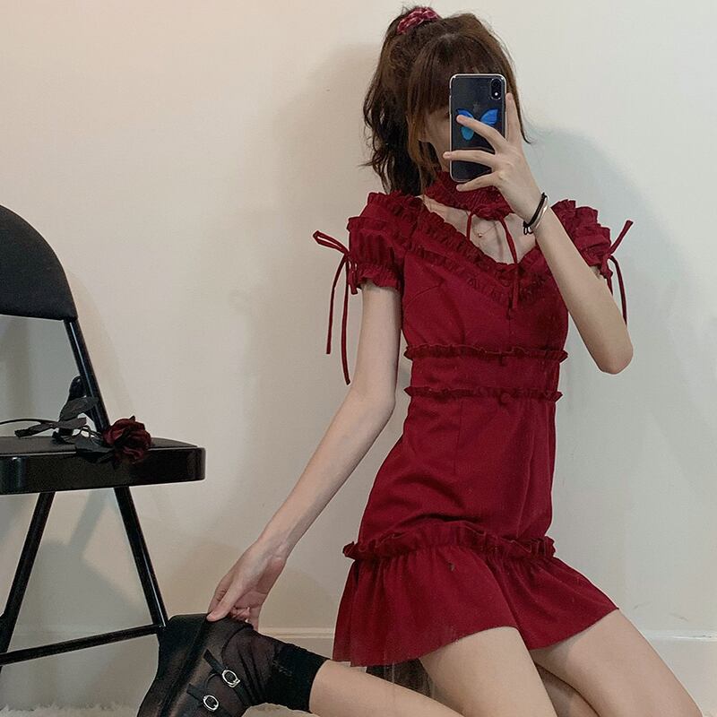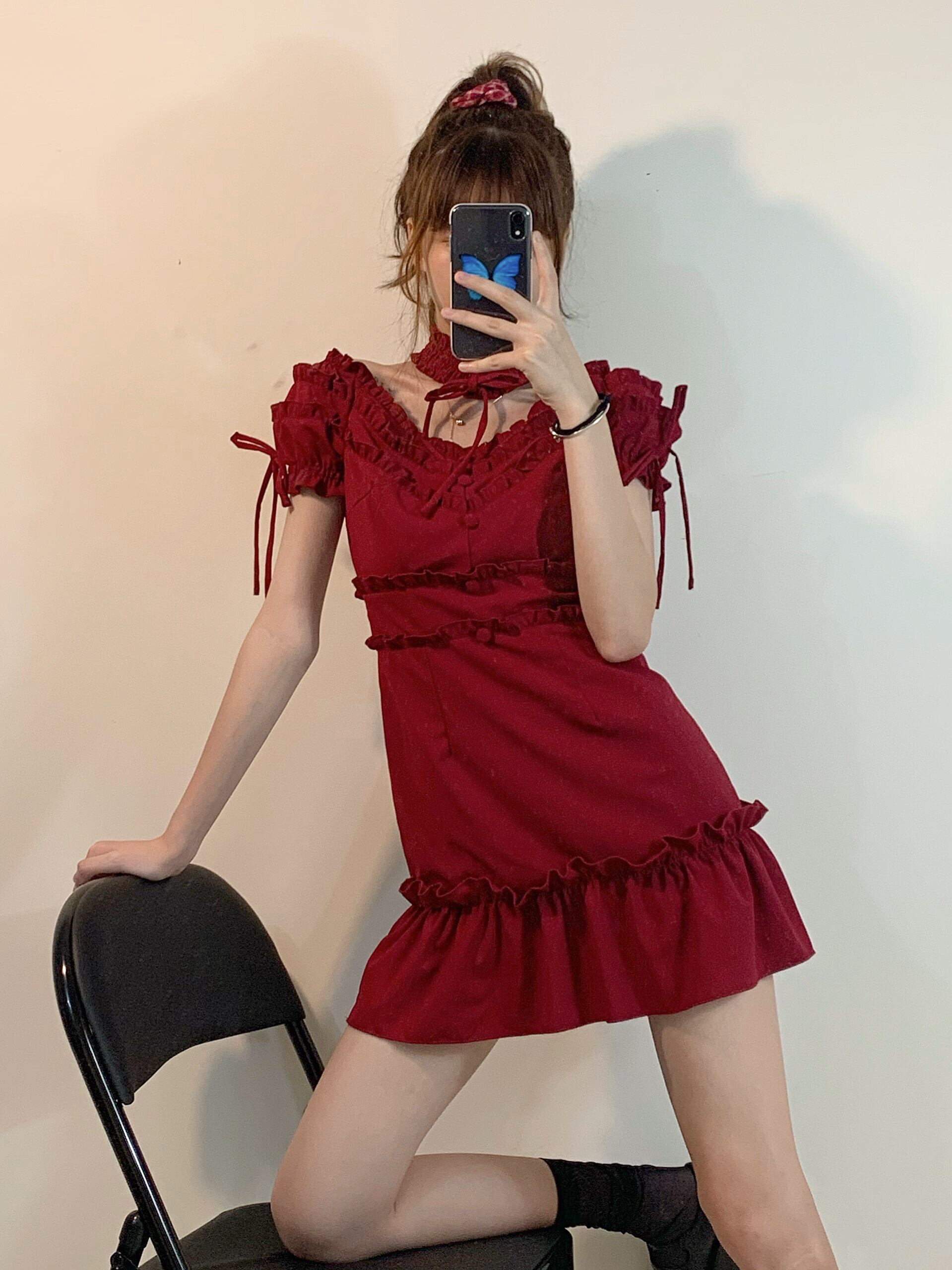 ✞ レースシフォン半袖スリーブりぼんフリルワンピースドレスOP チュニック ショート ハーフスリーブ ✞ゴスロリ SM ミリ 甘ロリ クラロリ 和ロリ エレガント 黒ロリ 姫ロリ 華ロリ BB-BB6352357