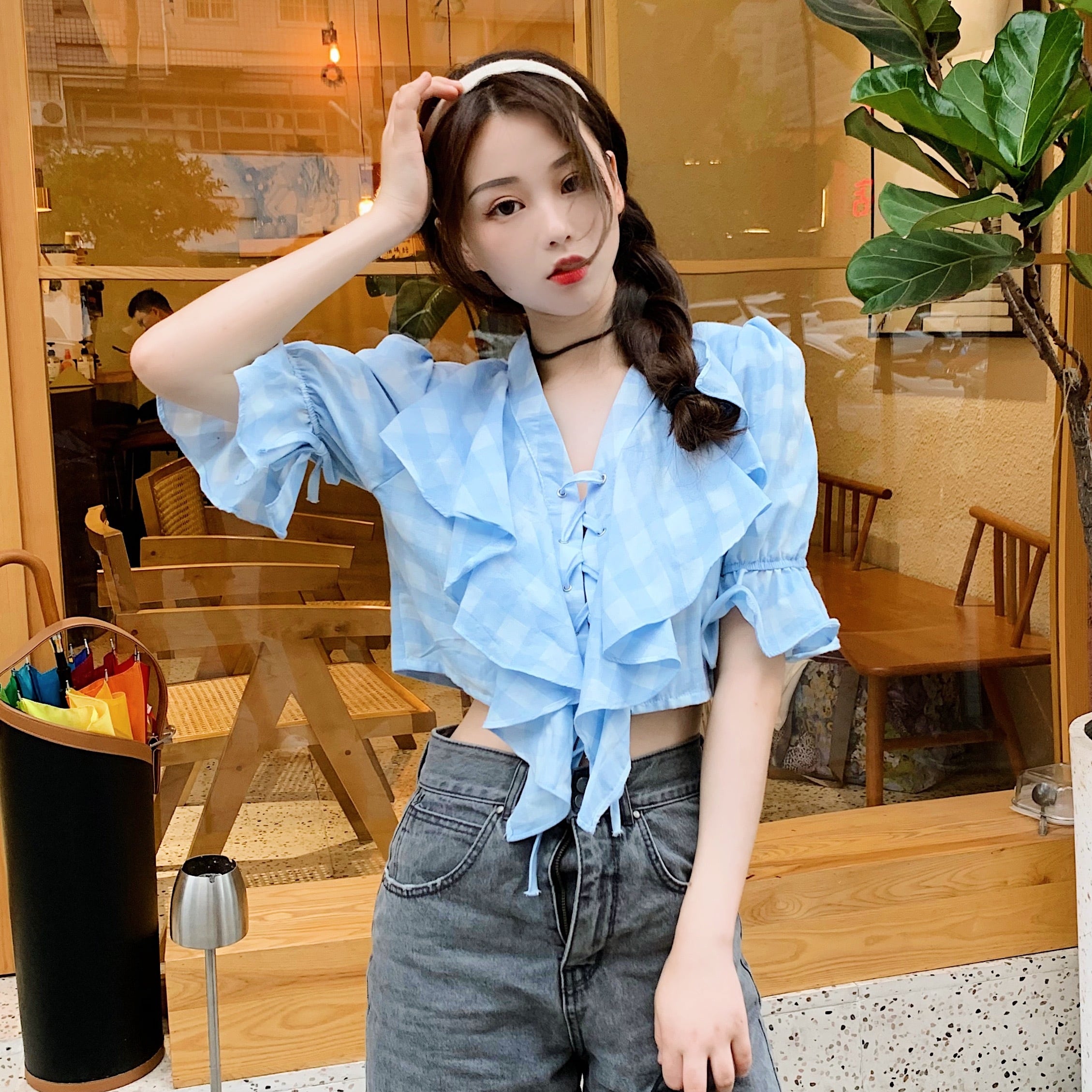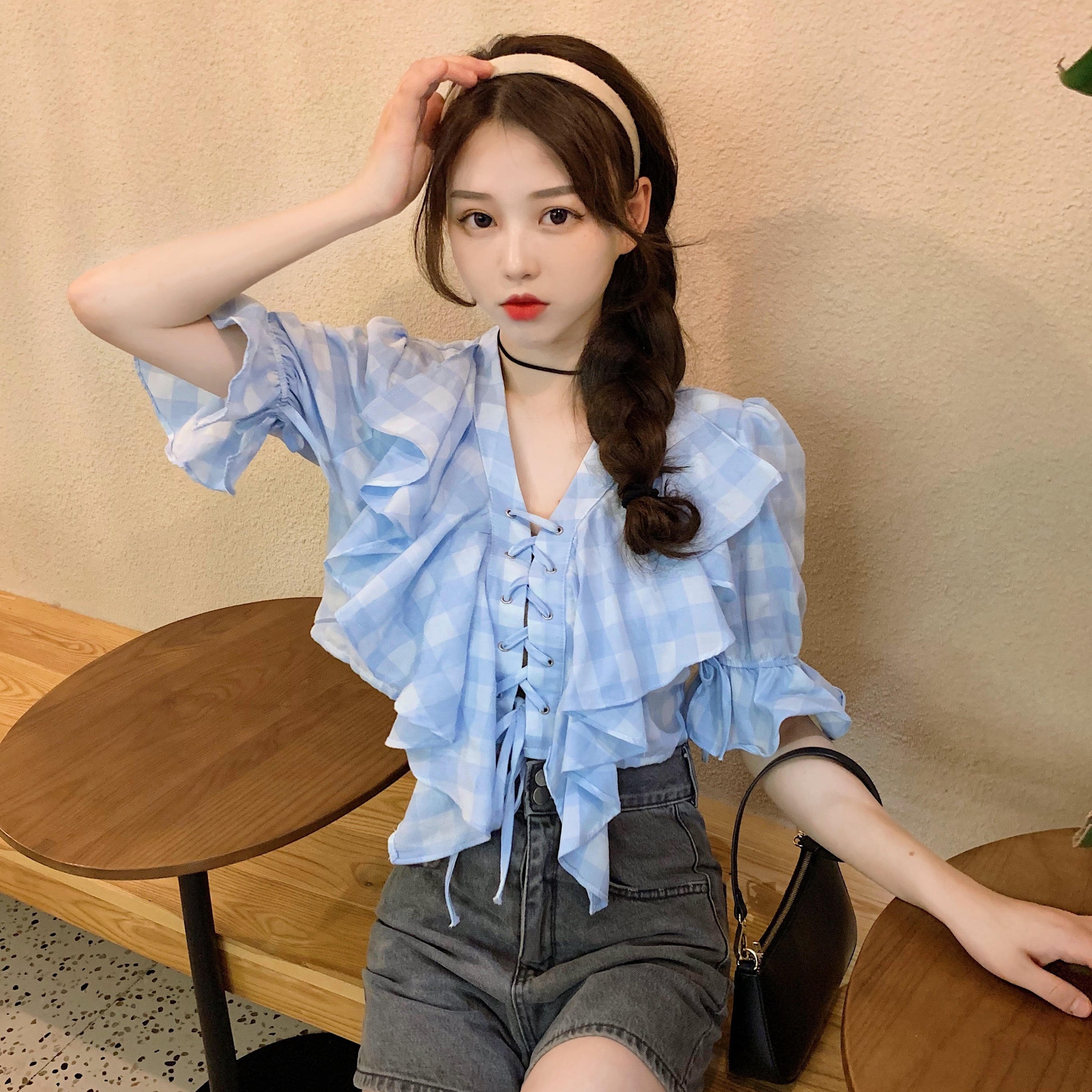 ✞ Vネックチェック柄シャツブラウススリーブショート ✞ゴスロリ SM ミリ 甘ロリ クラロリ 和ロリ エレガント 黒ロリ 姫ロリ 華ロリ BB-BB3350636