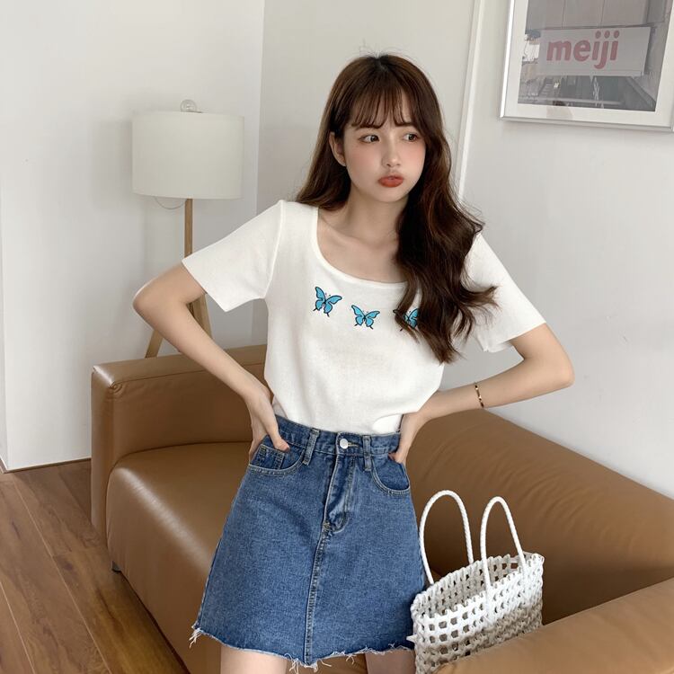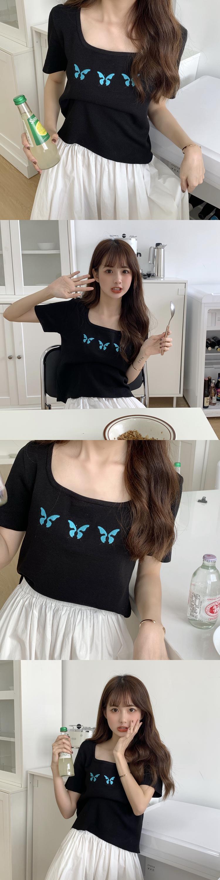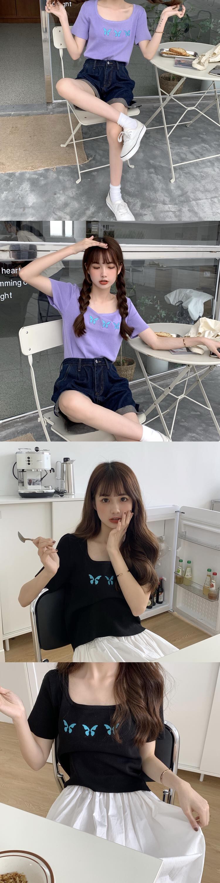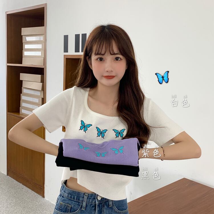 ✞ Butterflyデザイン 刺繍ショートセーター スリムラウンドネック半袖スリーブTシャツ ソリッド カラートップス ハーフスリーブ ソリッドカラー ✞ゴスロリ SM ミリ 甘ロリ クラロリ 和ロリ エレガント 黒ロリ 姫ロリ 華ロリ BB-BB9508027