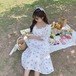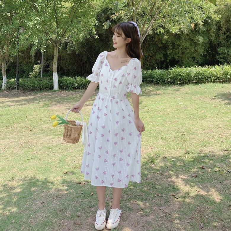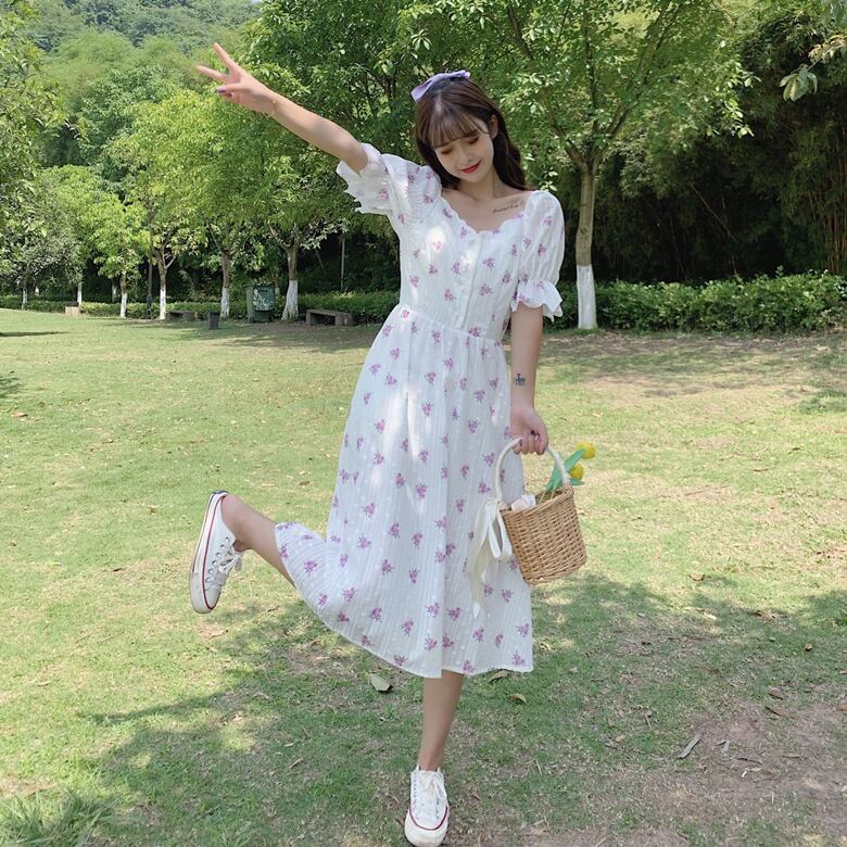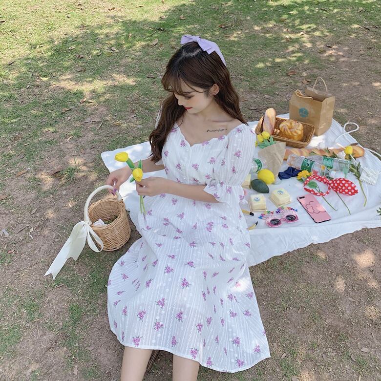 ✞ サマー花柄白スリーブVネックスカート ホワイト 夏物 フラワーデザイン パープル ✞ゴスロリ SM ミリ 甘ロリ クラロリ 和ロリ エレガント 黒ロリ 姫ロリ 華ロリ BB-BB1963653