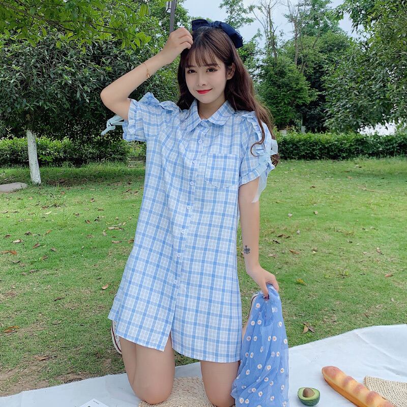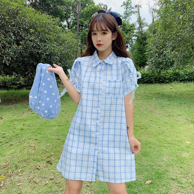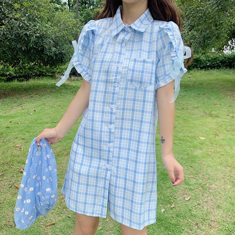 ✞ チェック柄スカート リボンブルーシャツブラウス 大人ガーリー スウィート キュート カジュアル ✞ゴスロリ SM ミリ 甘ロリ クラロリ 和ロリ エレガント 黒ロリ 姫ロリ 華ロリ BB-BB1649053