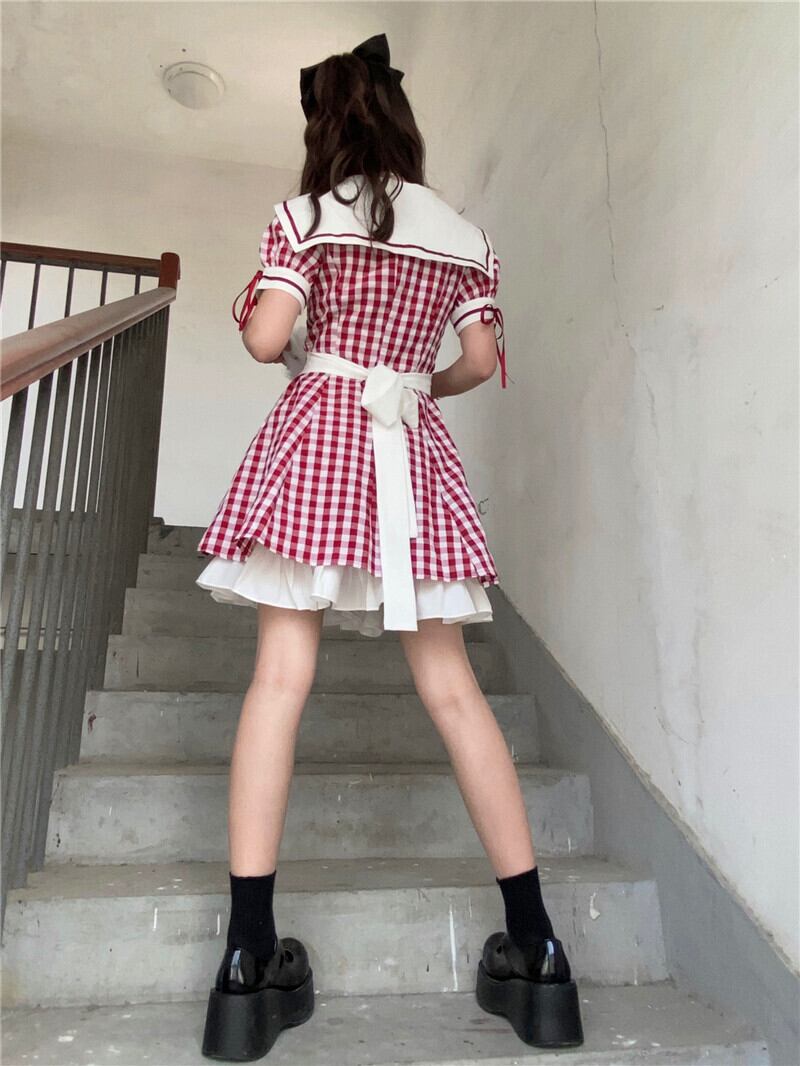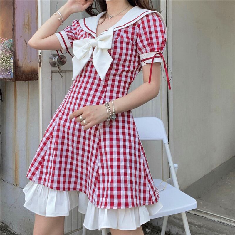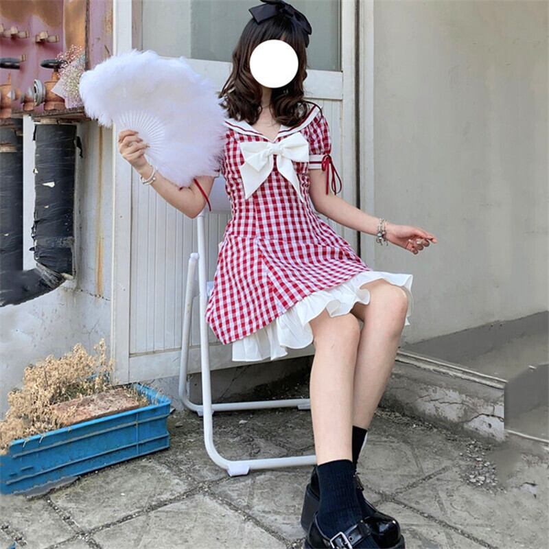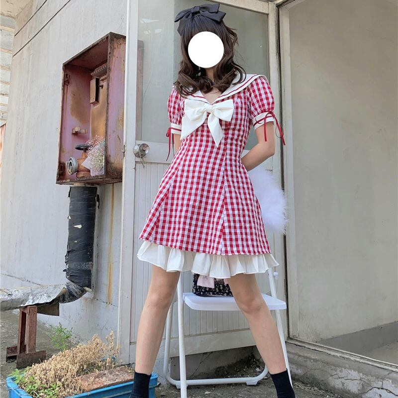 ✞ チェック柄フリルセーラーカラーおおきめリボンワンピース レース レトロ 大人ガーリー スウィート キュート カジュアル ✞ゴスロリ SM ミリ 甘ロリ クラロリ 和ロリ エレガント 黒ロリ 姫ロリ 華ロリ BB-BB2847539