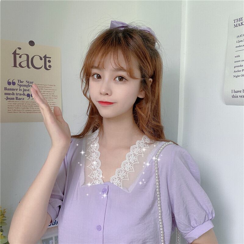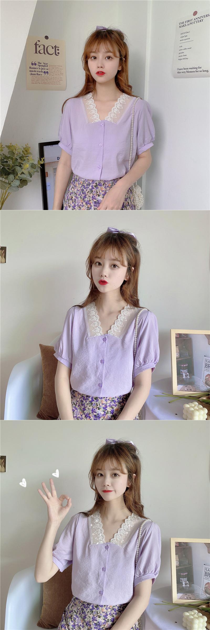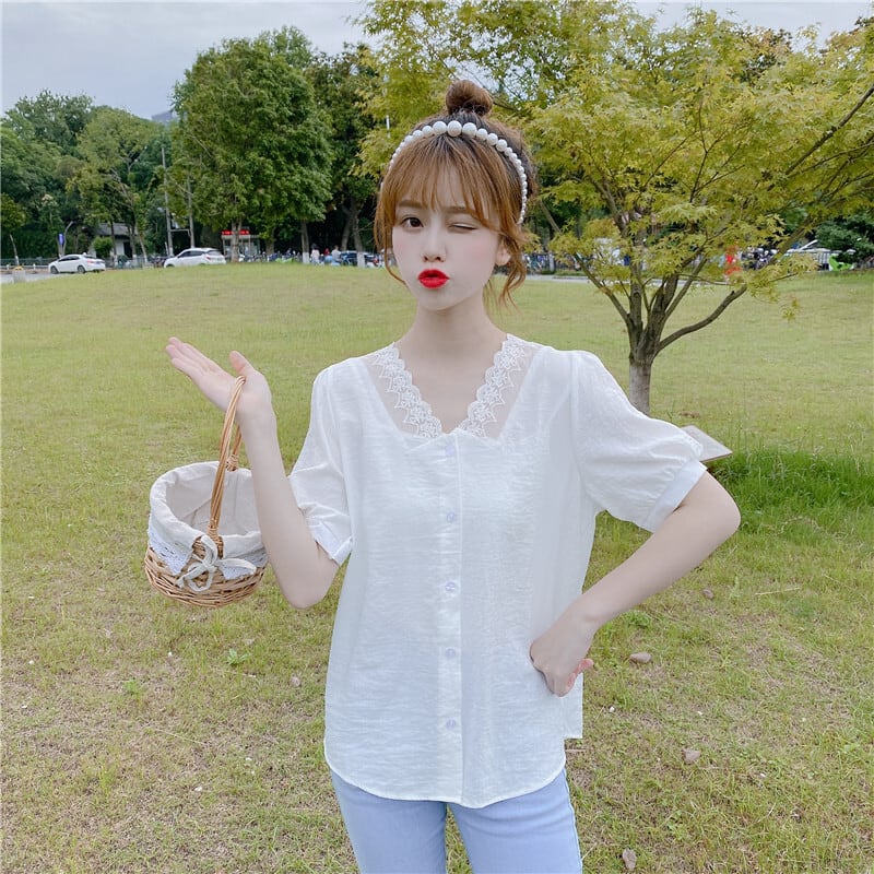 ✞ Vネックレースショートソリッド カラーシャツブラウス大人女子☆ 大人ガーリー スウィート キュート カジュアル ソリッドカラー ✞ゴスロリ SM ミリ 甘ロリ クラロリ 和ロリ エレガント 黒ロリ 姫ロリ 華ロリ BB-BB2493644