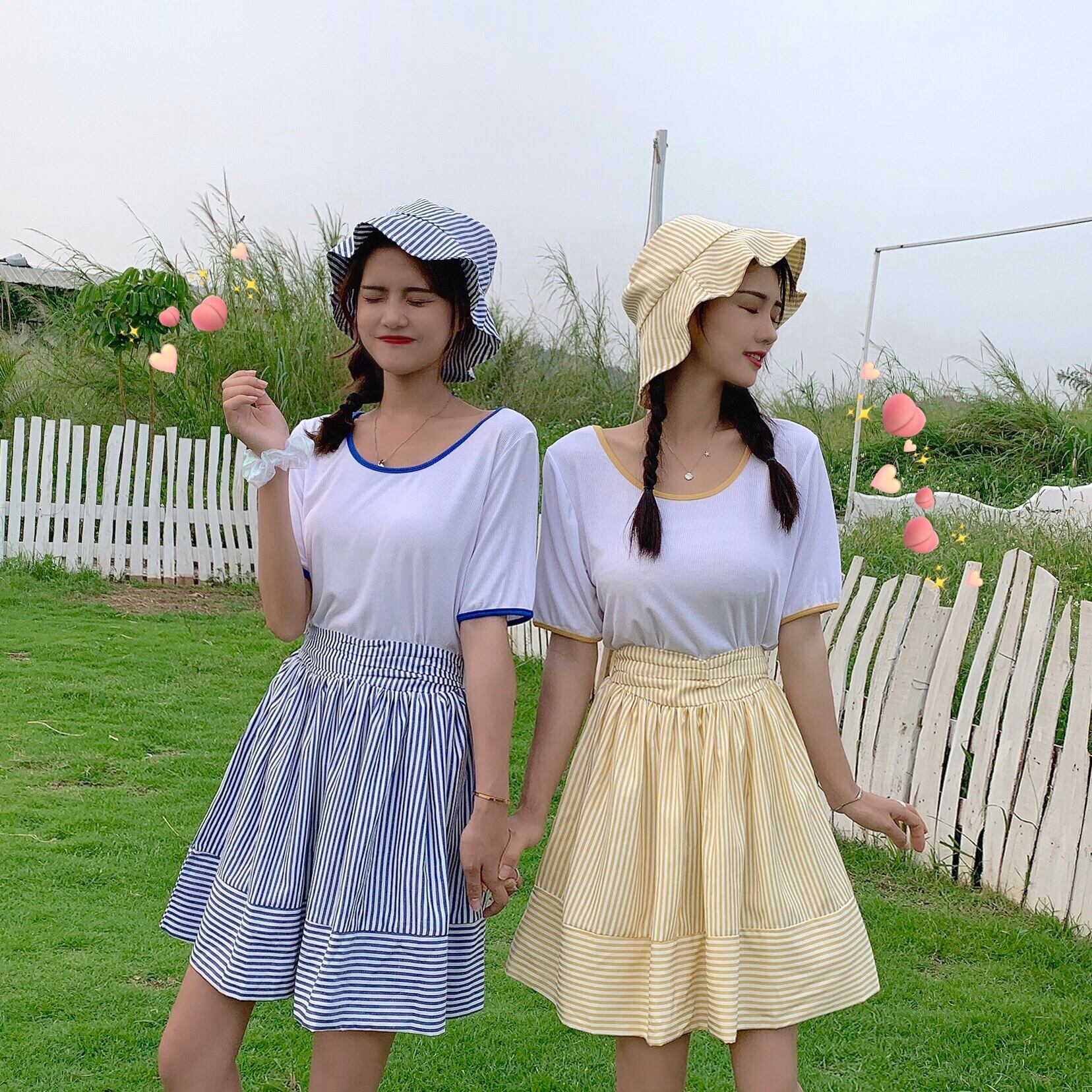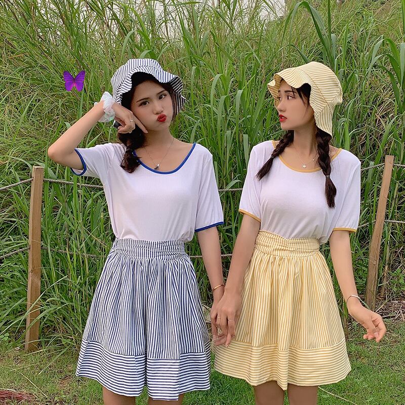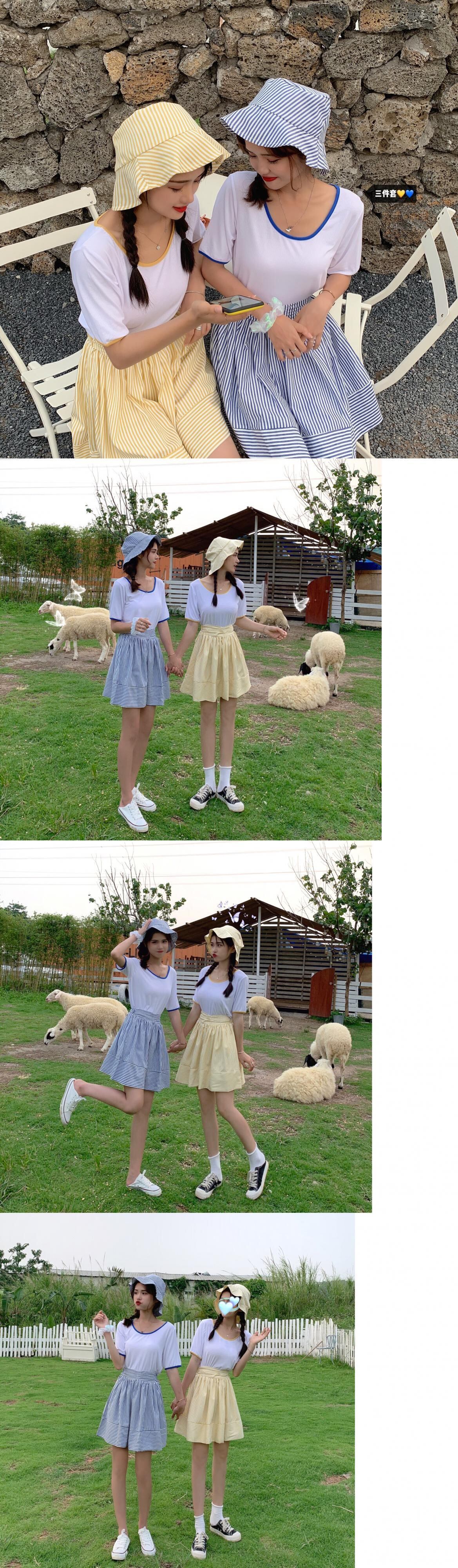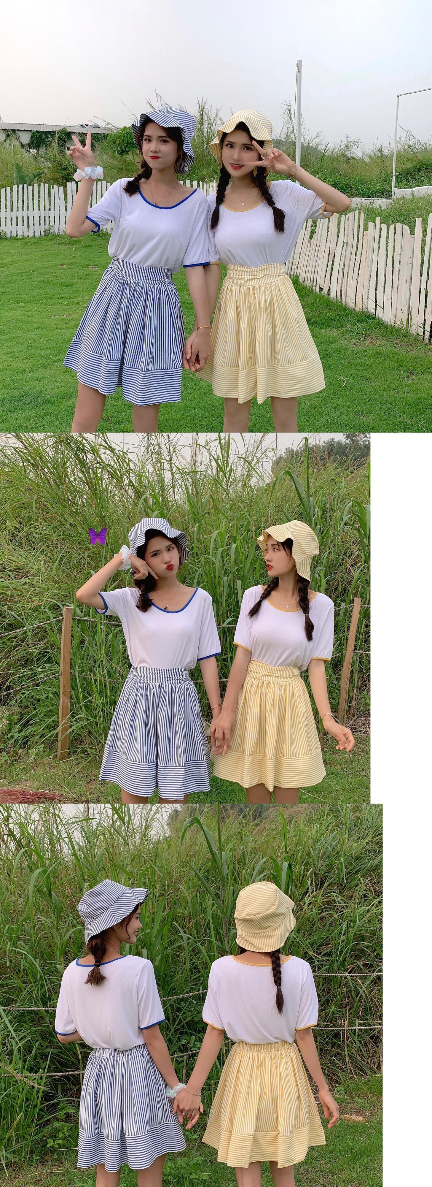 色:ブルートップ+スカート(ハットを送る),黄色いシャツ+スカート(帽子を送る)