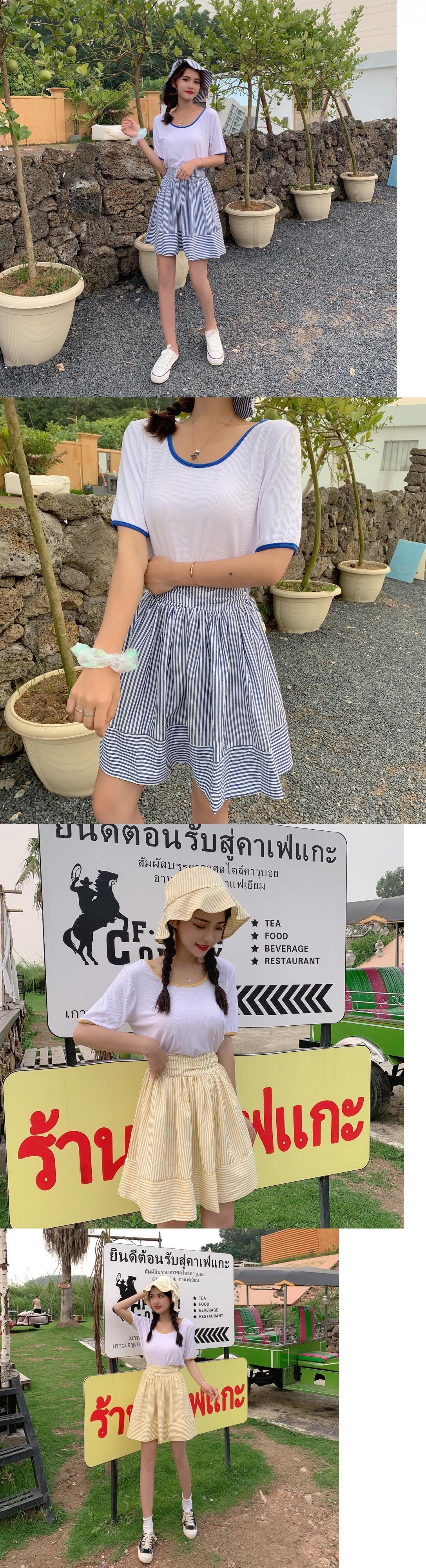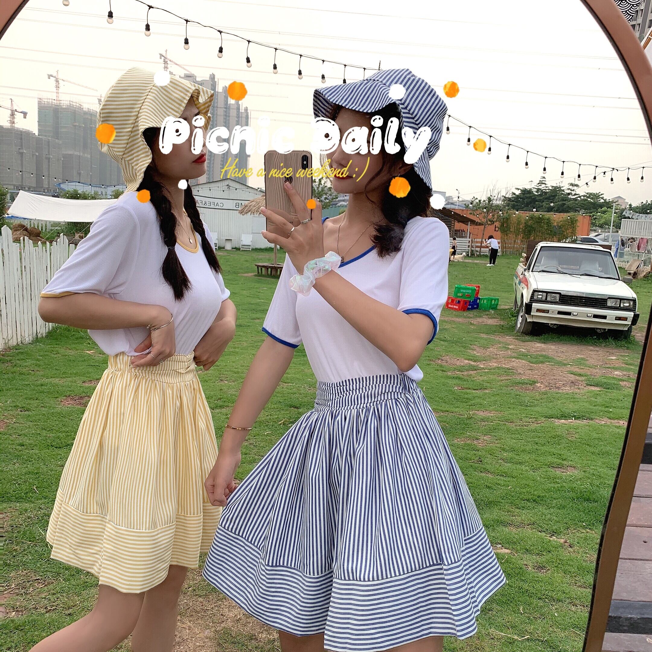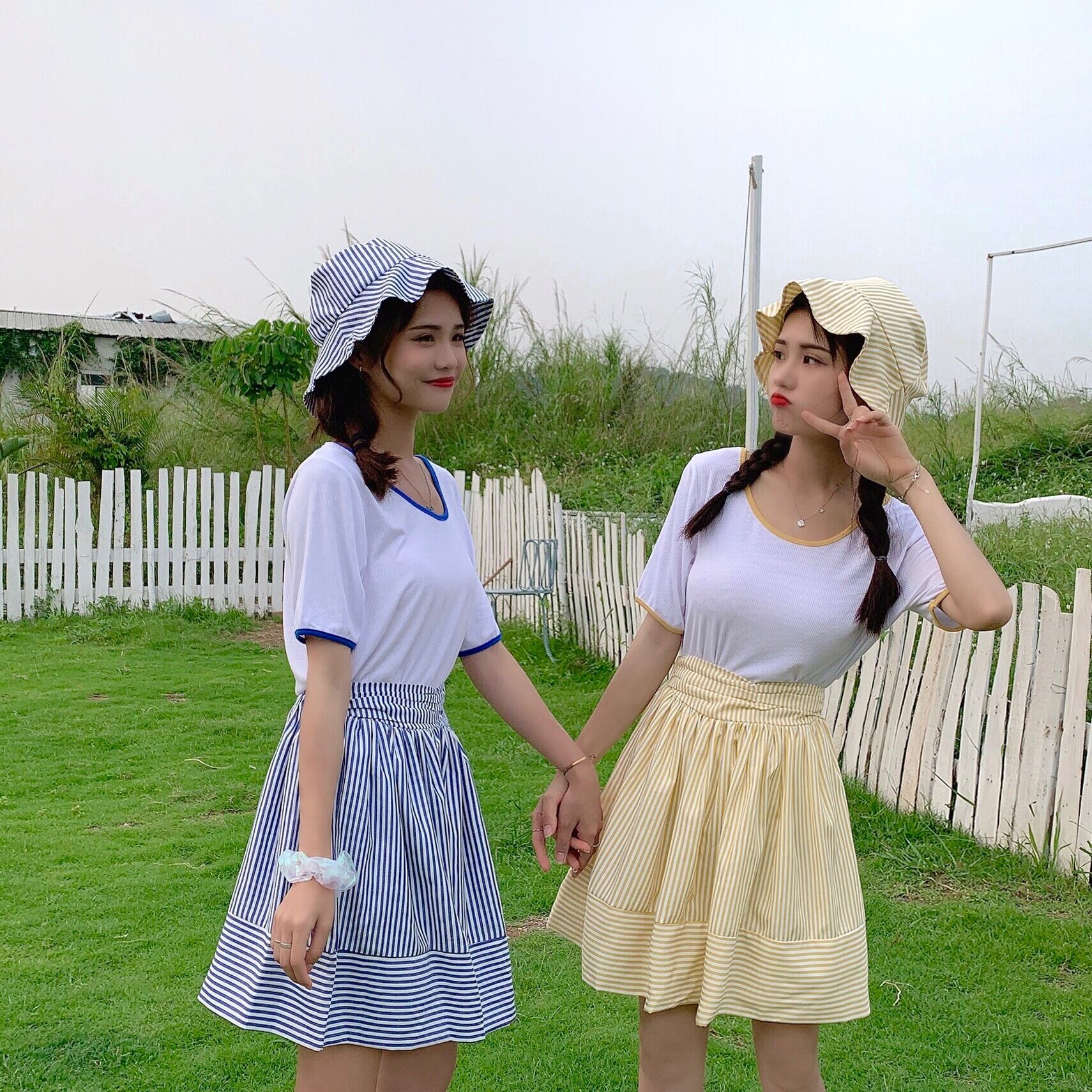 色:ブルートップ+スカート(ハットを送る),黄色いシャツ+スカート(帽子を送る)