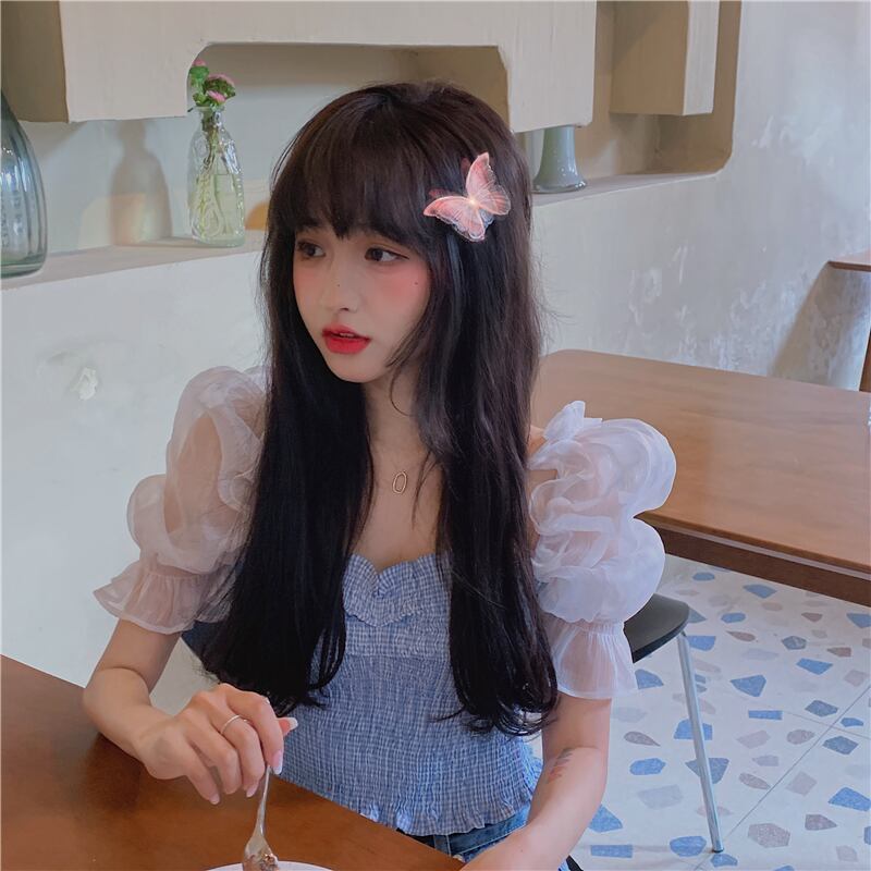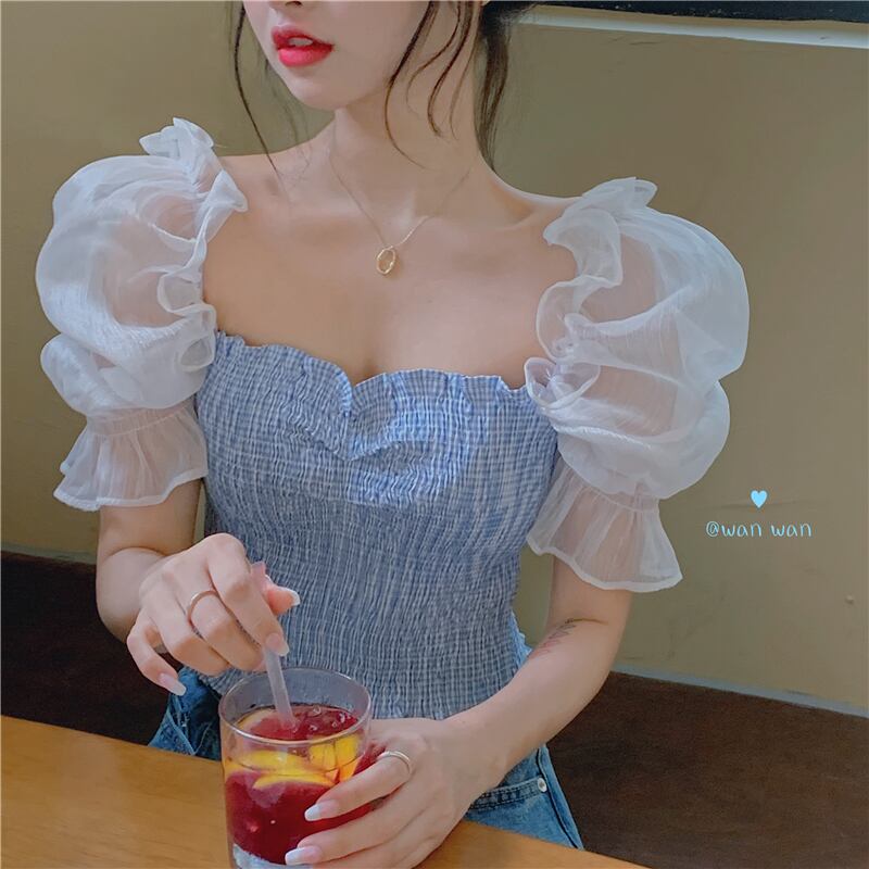 ✞ スタンダードきれいめ☆メッシュスリーブチェック柄プリーツスリムショートシャツブラウス レトロ レース スクウェア ✞ゴスロリ SM ミリ 甘ロリ クラロリ 和ロリ エレガント 黒ロリ 姫ロリ 華ロリ BB-BB7173415