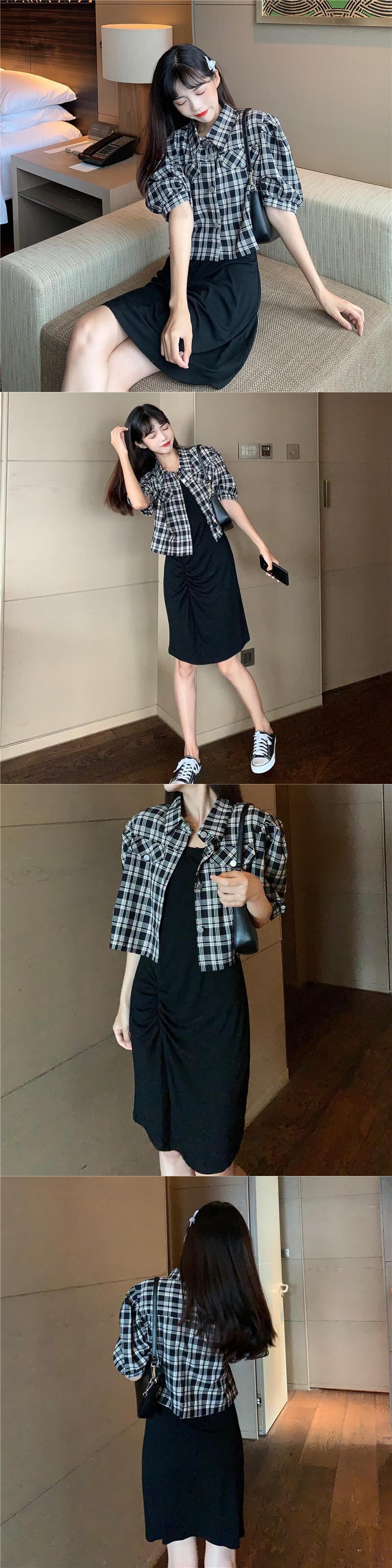 色:ブラックチェック柄シャツワンピース,オレンジチェックトップワンピース,ブラックサスペンダースカートシングル,オレンジのサスペンダースカートワンピース