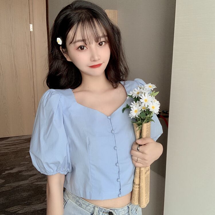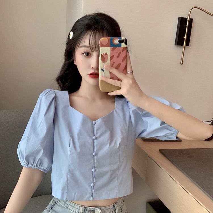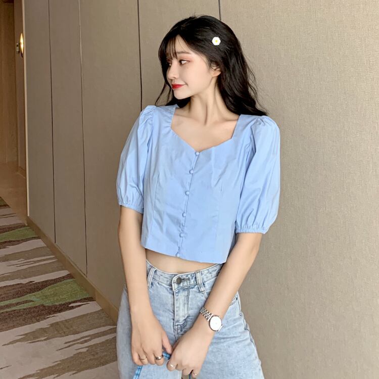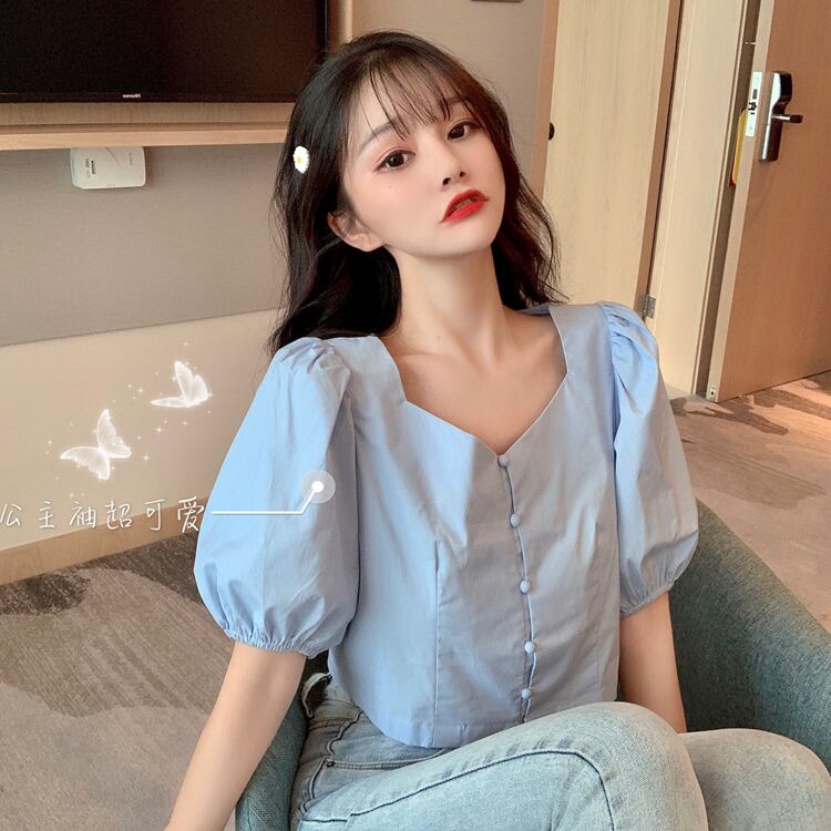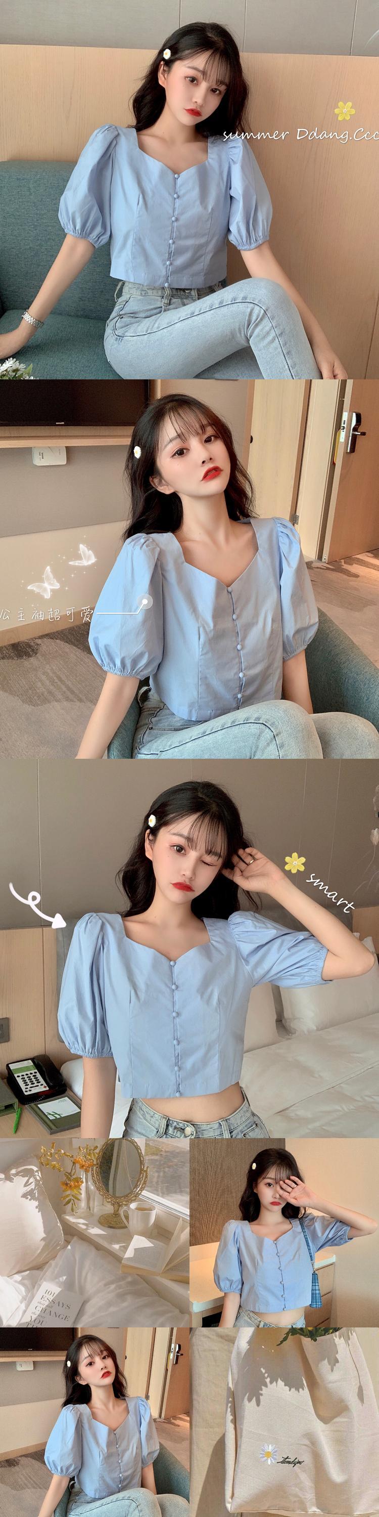 ✞ シャツブラウスショート♬カワイイ♥半袖スリーブブルー大人女子☆ ハーフスリーブ スクウェア ✞ゴスロリ SM ミリ 甘ロリ クラロリ 和ロリ エレガント 黒ロリ 姫ロリ 華ロリ BB-BB4498372