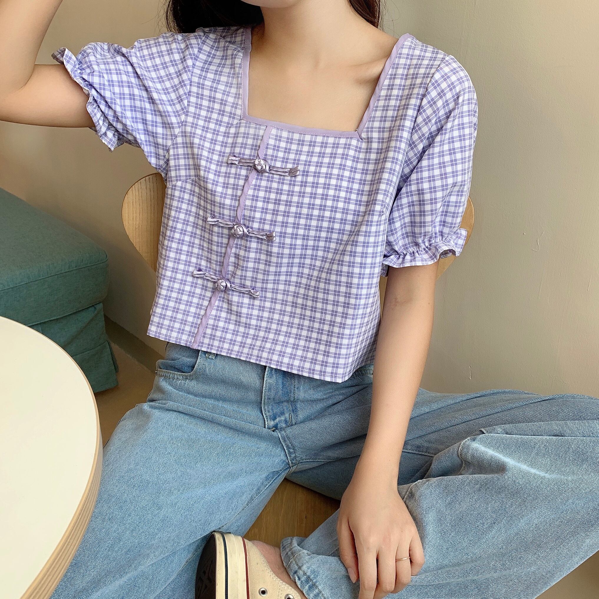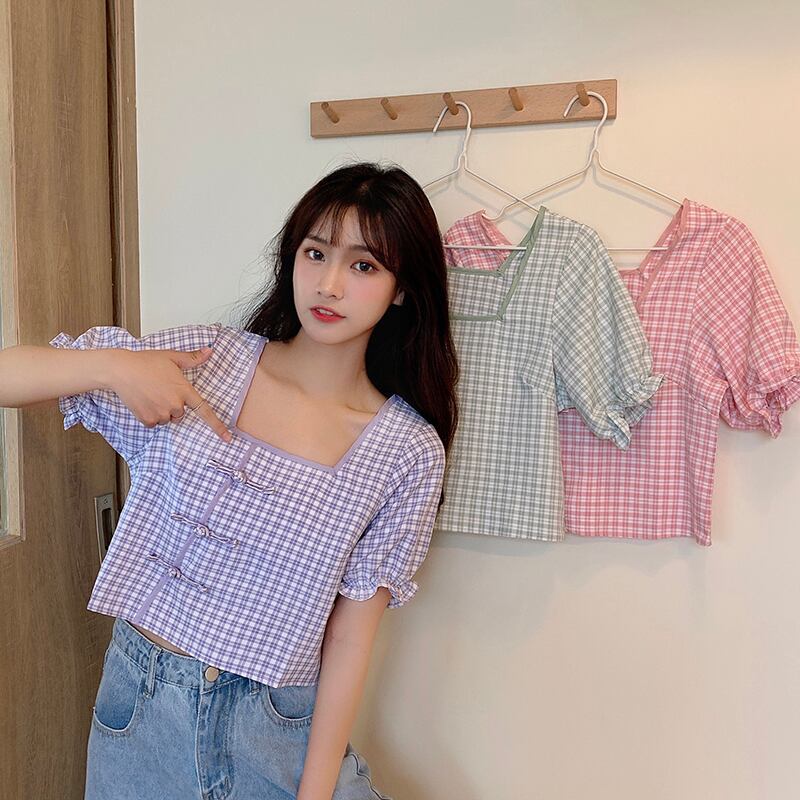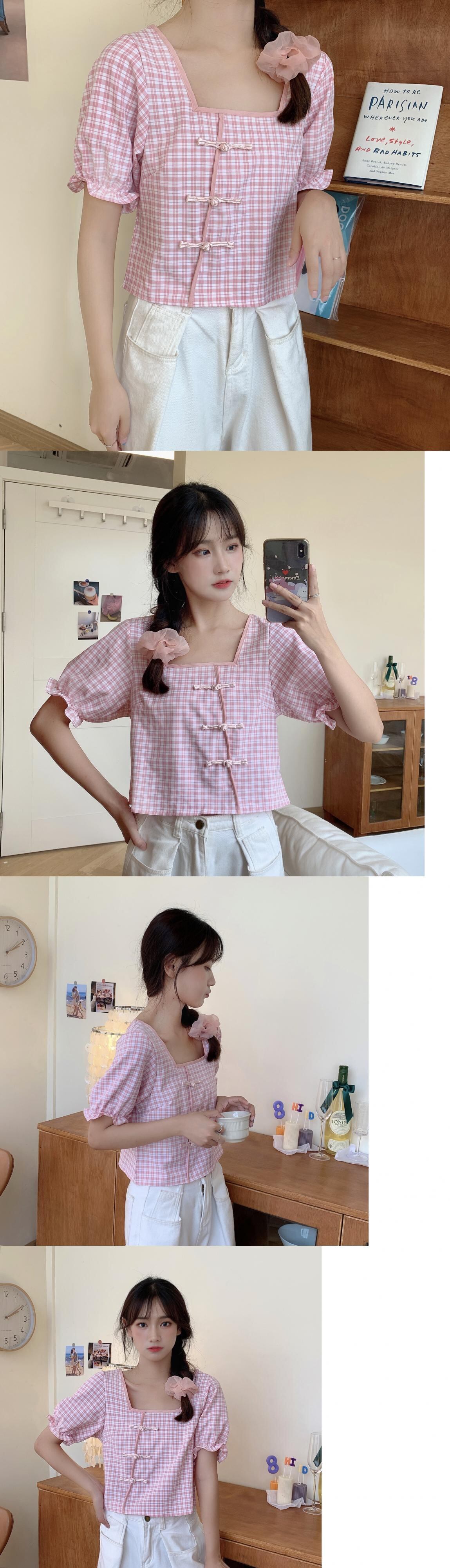 ✞ スリムスタンダードバックルチェック柄ショートシャツブラウス ランタンスリーブ レトロ スクウェア ✞ゴスロリ SM ミリ 甘ロリ クラロリ 和ロリ エレガント 黒ロリ 姫ロリ 華ロリ BB-BB7044698
