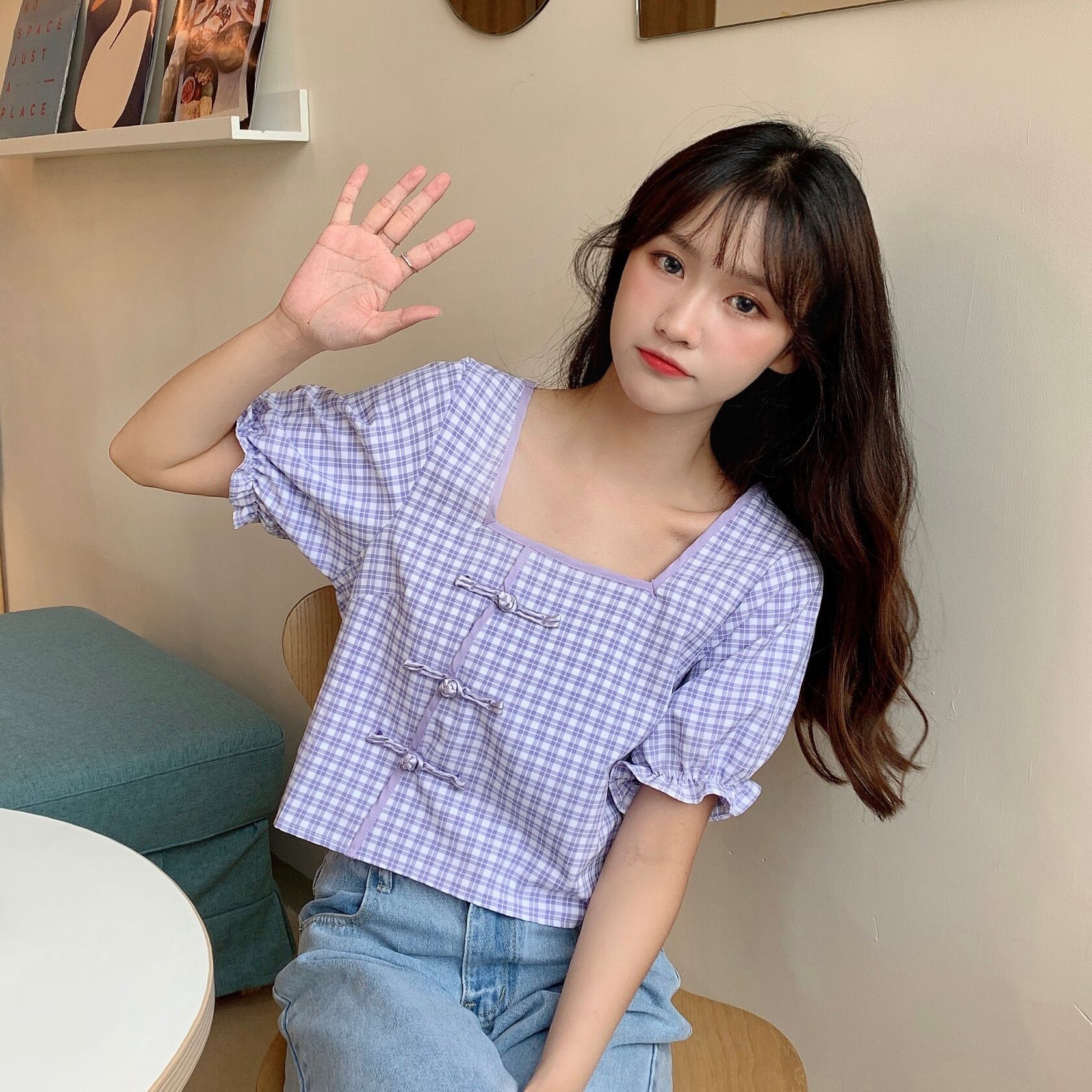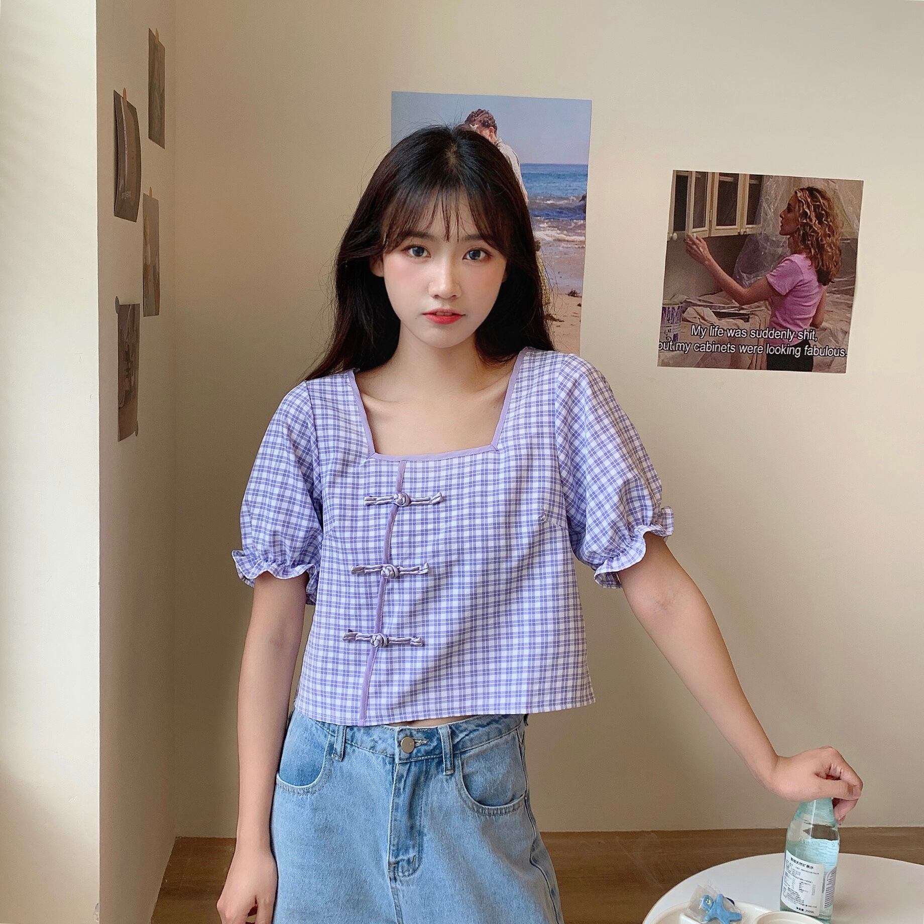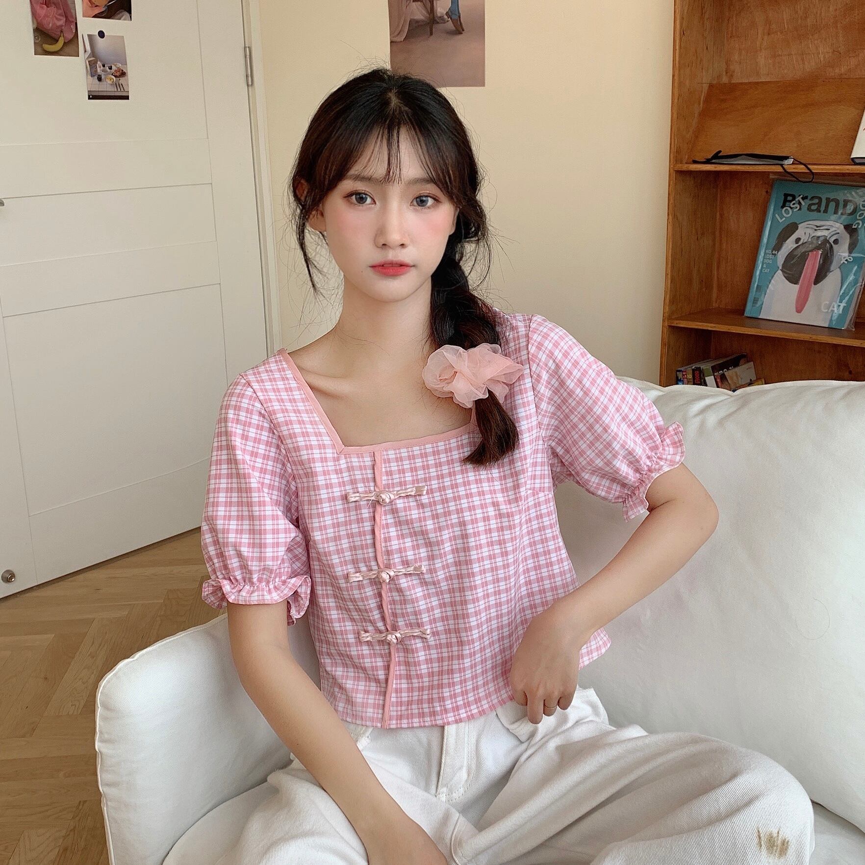 ✞ スリムスタンダードバックルチェック柄ショートシャツブラウス ランタンスリーブ レトロ スクウェア ✞ゴスロリ SM ミリ 甘ロリ クラロリ 和ロリ エレガント 黒ロリ 姫ロリ 華ロリ BB-BB7044698