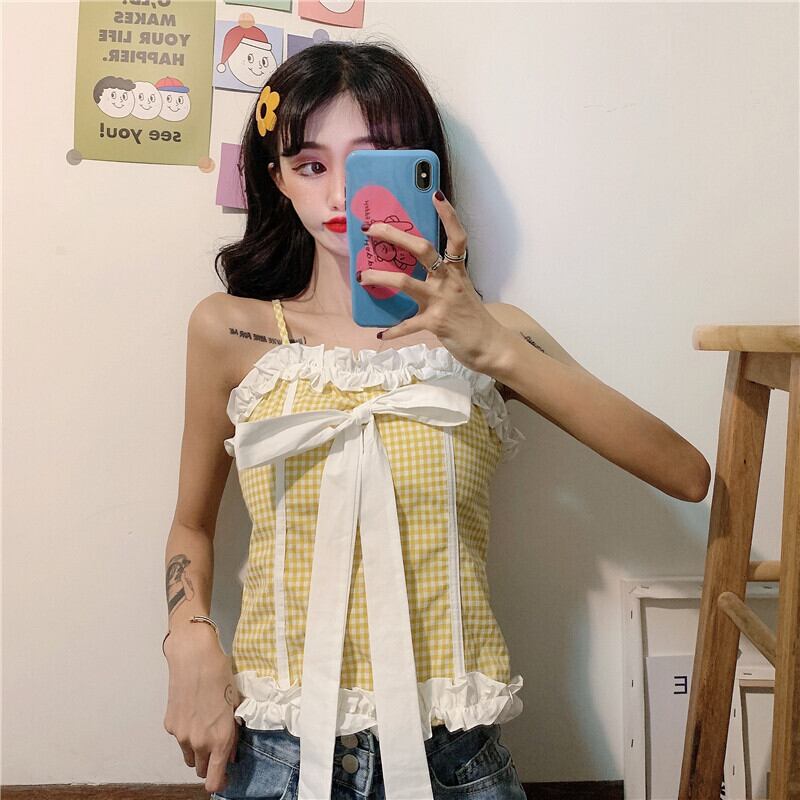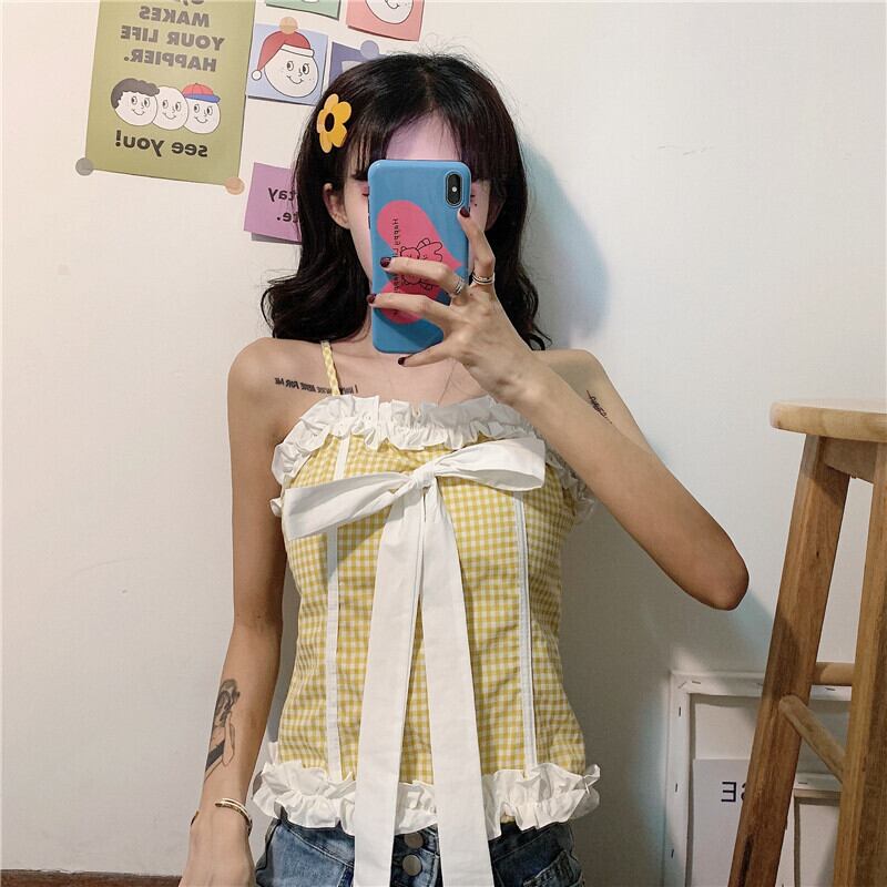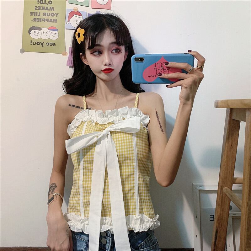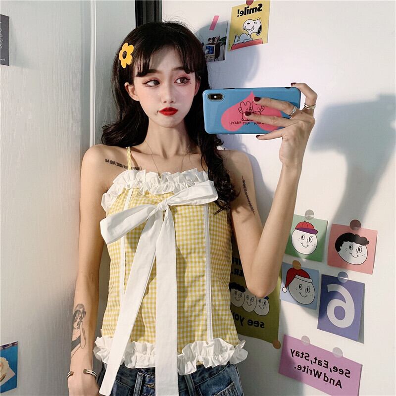 ✞ トップス カラーリボンチェック柄ショートキャミソール 大人ガーリー スウィート キュート カジュアル ✞ゴスロリ SM ミリ 甘ロリ クラロリ 和ロリ エレガント 黒ロリ 姫ロリ 華ロリ BB-BB1669338