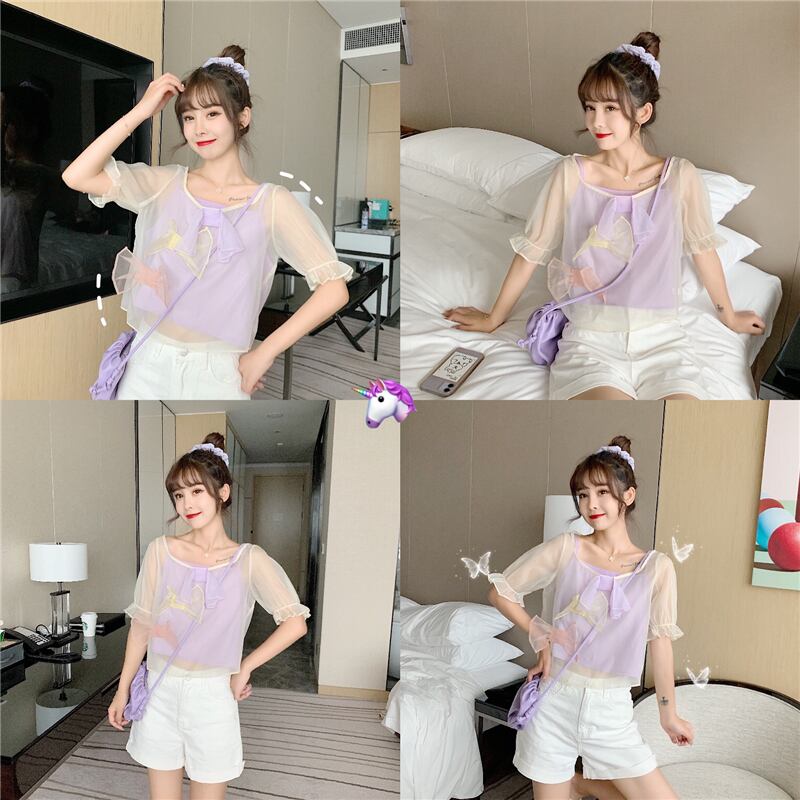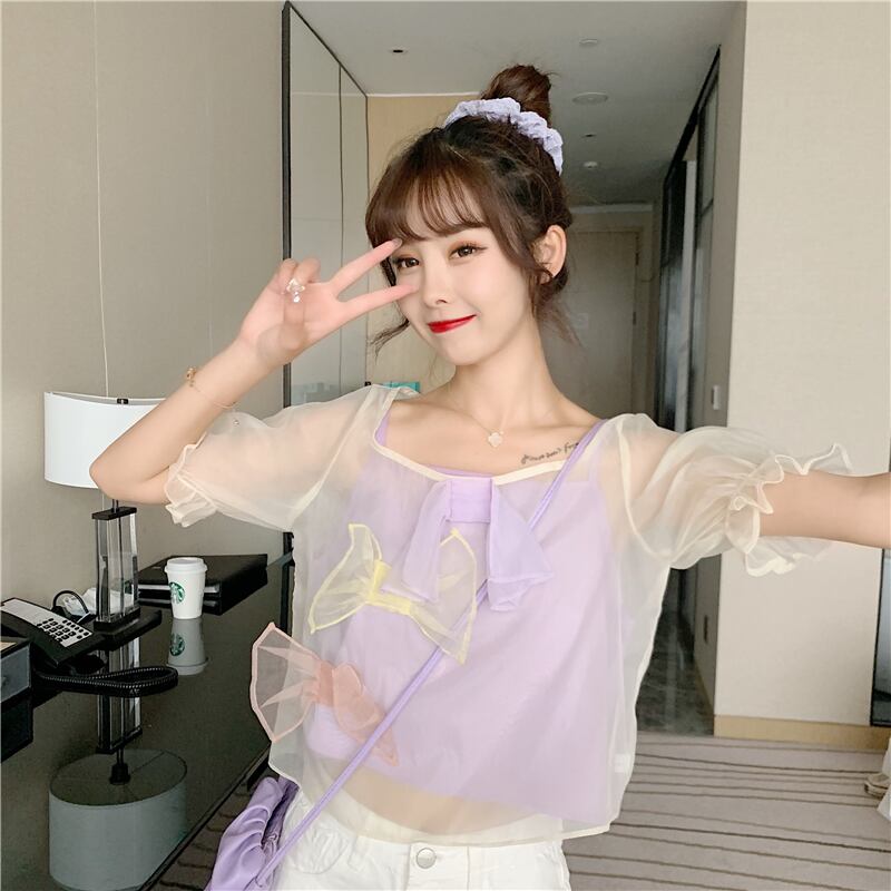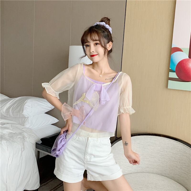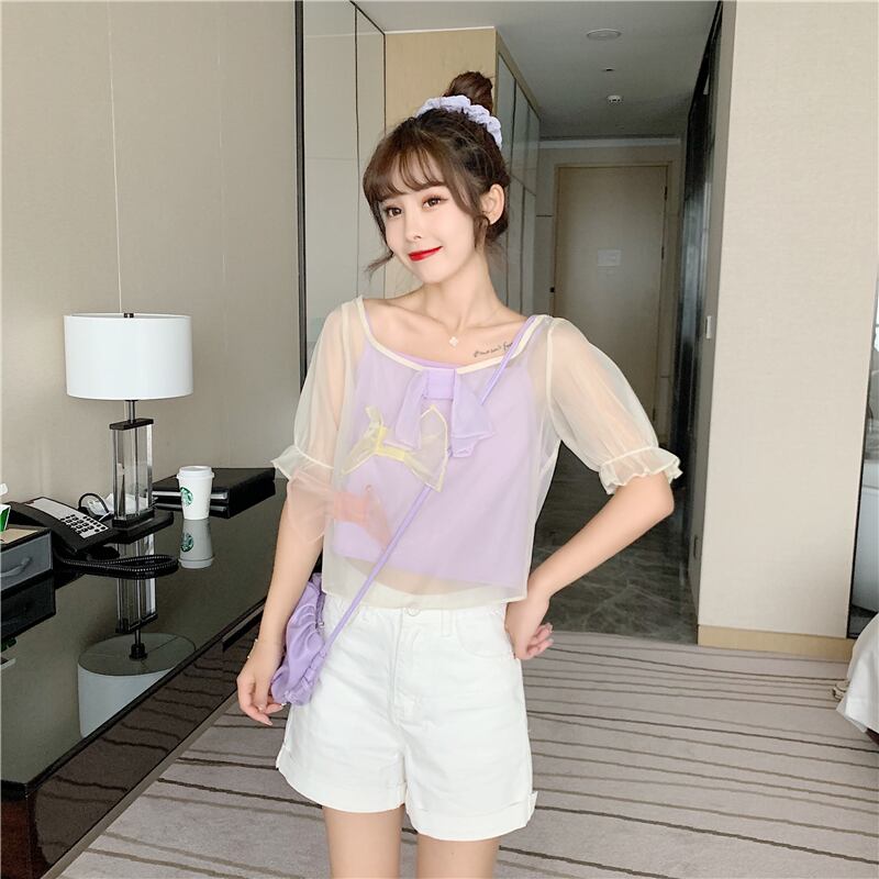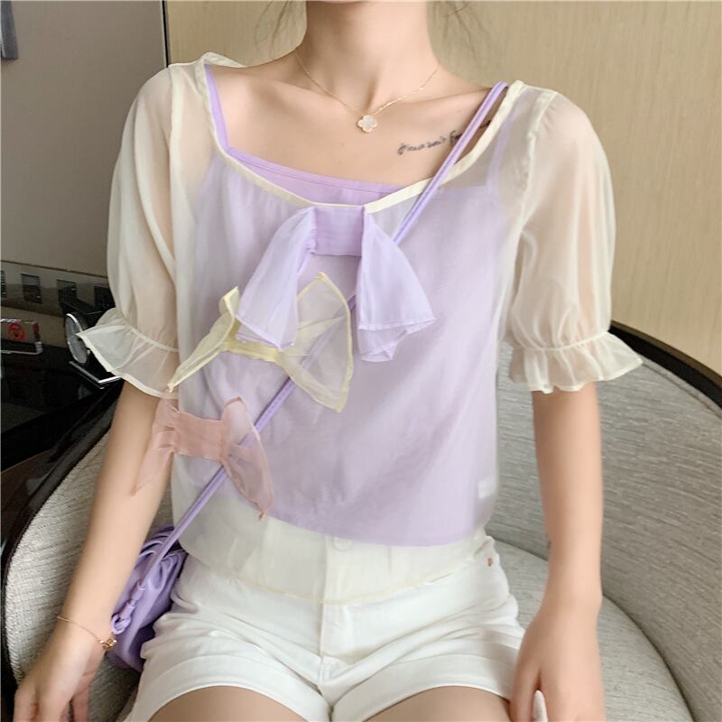✞ メッシュカラーリボンショートブラウス シフォンシャツブラウストップス 大人ガーリー スウィート キュート カジュアル ステッチ ✞ゴスロリ SM ミリ 甘ロリ クラロリ 和ロリ エレガント 黒ロリ 姫ロリ 華ロリ BB-BB2307936