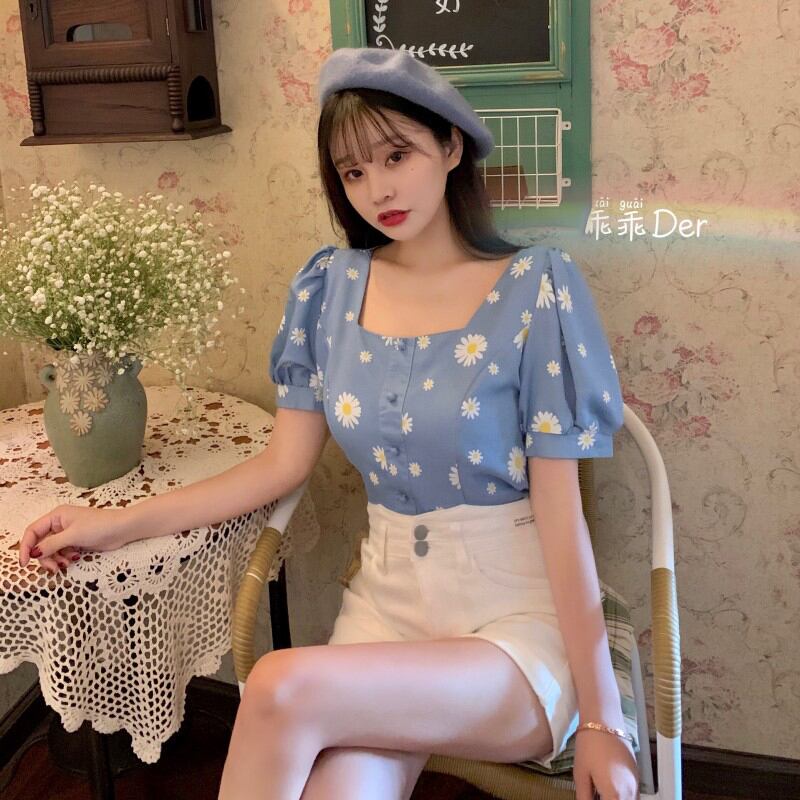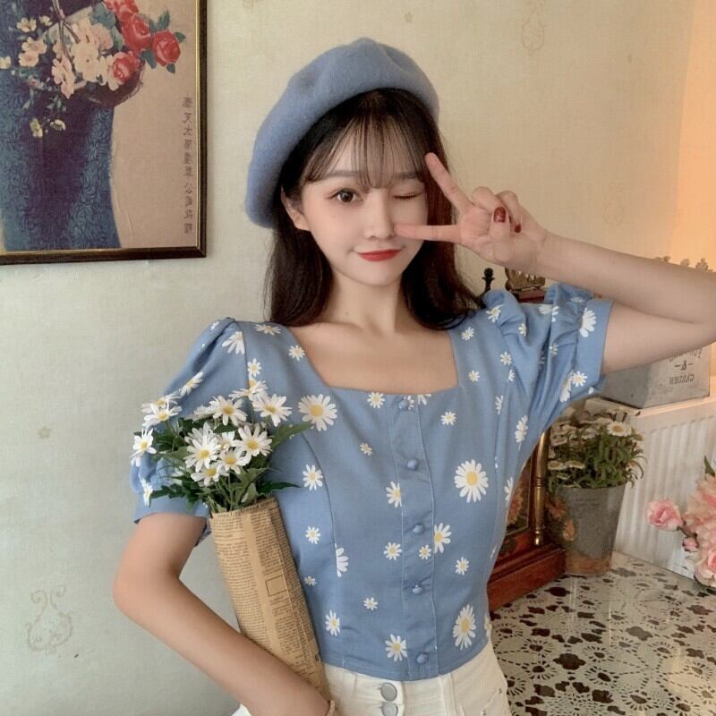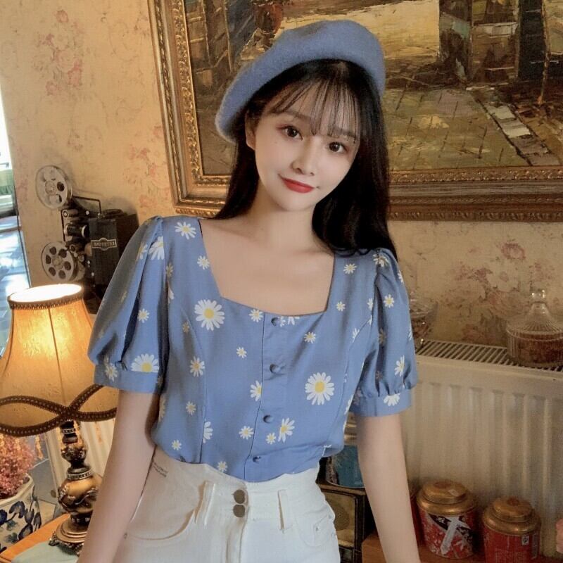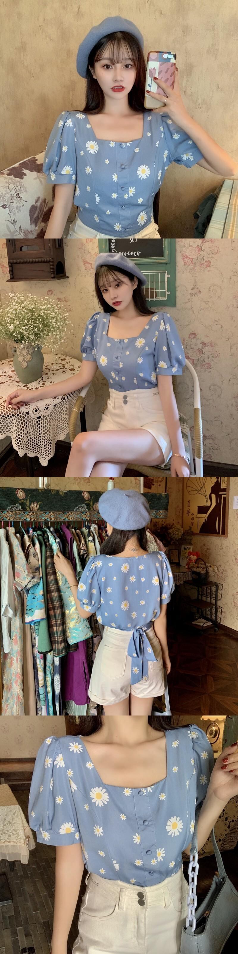 ✞ ショートシャツブラウススタンダードブルー花柄プリントスリーブバックトップス レトロ 大人ガーリー スウィート キュート カジュアル フラワーデザイン ✞ゴスロリ SM ミリ 甘ロリ クラロリ 和ロリ エレガント 黒ロリ 姫ロリ 華ロリ BB-BB8184170
