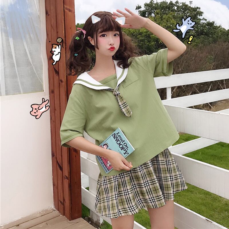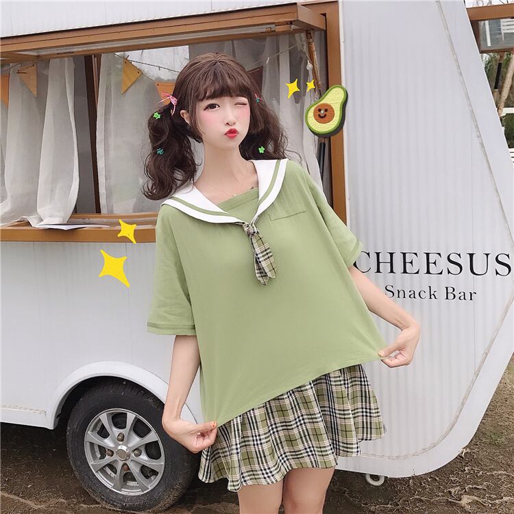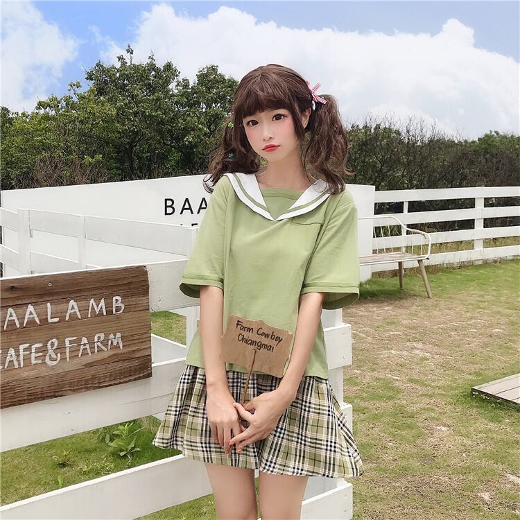 色:フルーツグリーンTシャツ,格子縞のスカートワンピース