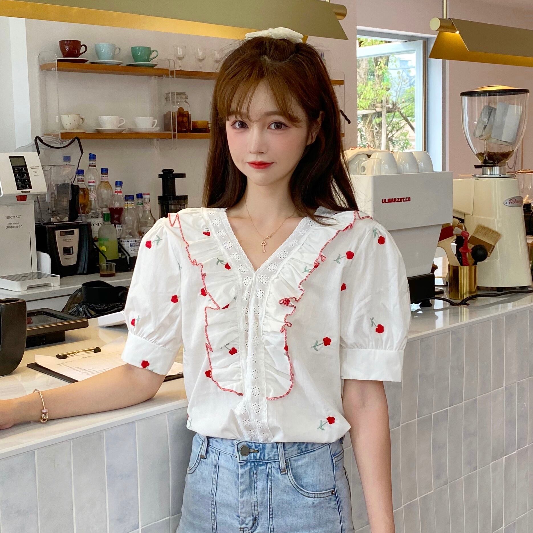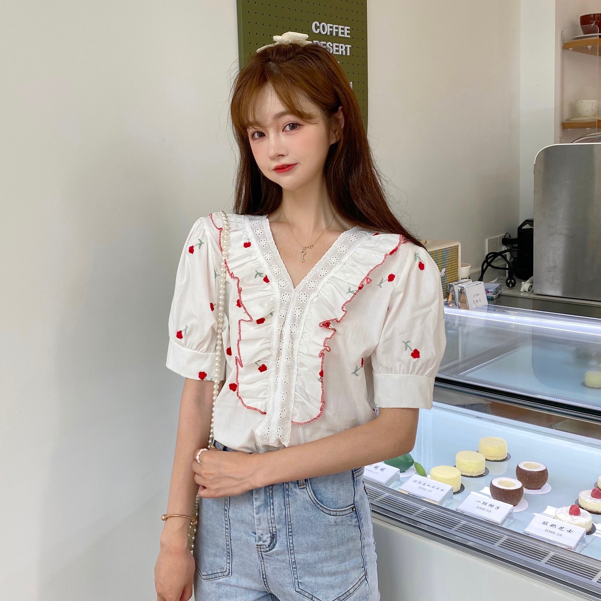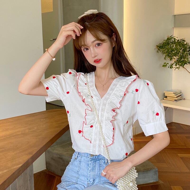 ✞ シャツブラウスVネック花柄刺繍スリーブ 大人ガーリー スウィート キュート カジュアル フラワーデザイン ✞ゴスロリ SM ミリ 甘ロリ クラロリ 和ロリ エレガント 黒ロリ 姫ロリ 華ロリ BB-BB1937310
