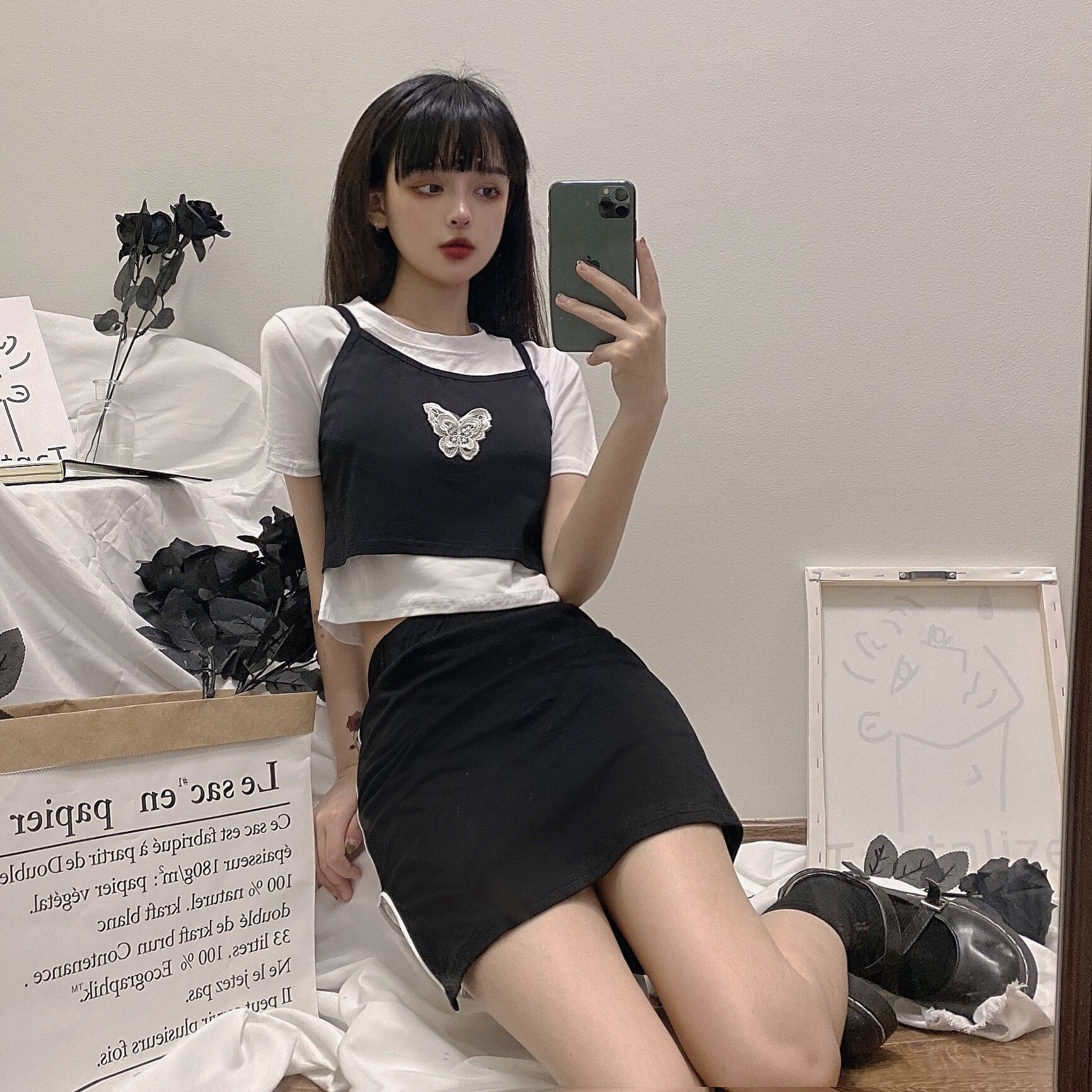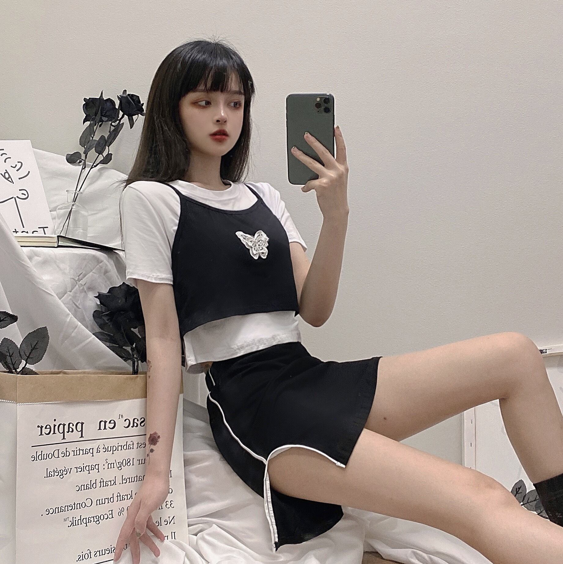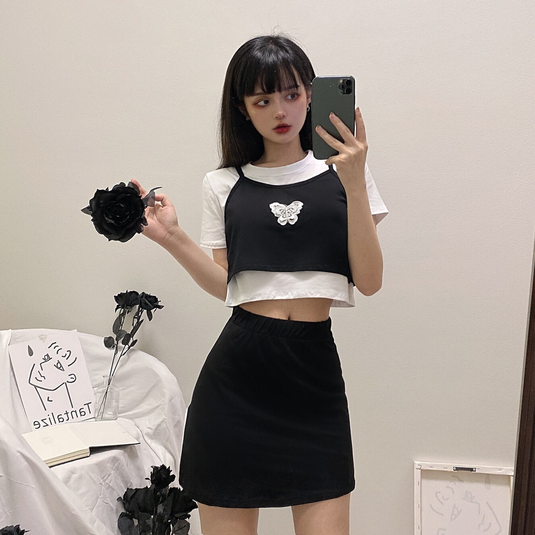 色:ブラックとホワイトのフェイクツーピーストップ,ブラックスカートワンピース