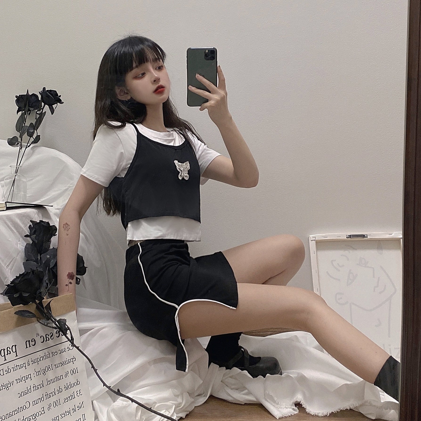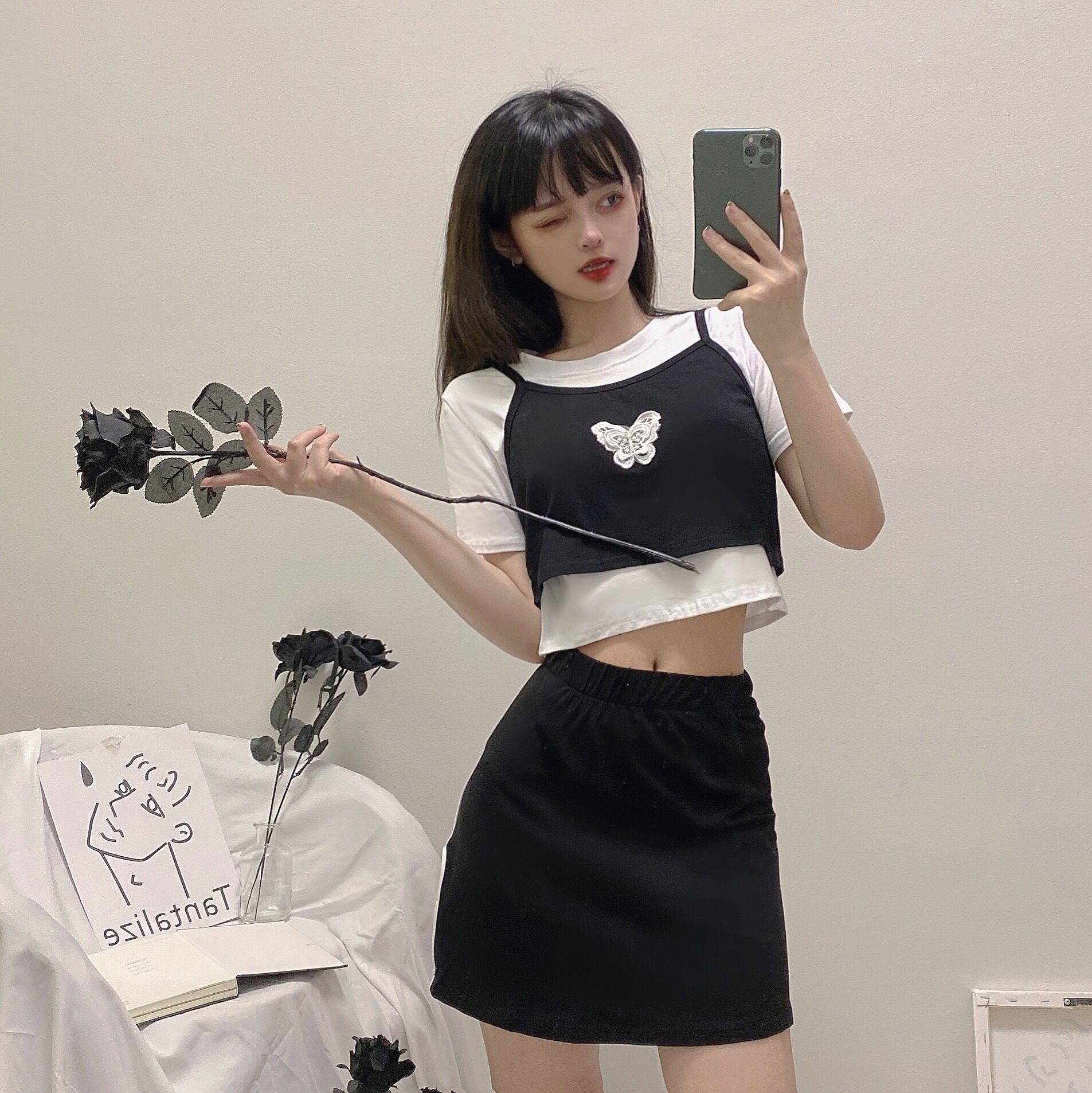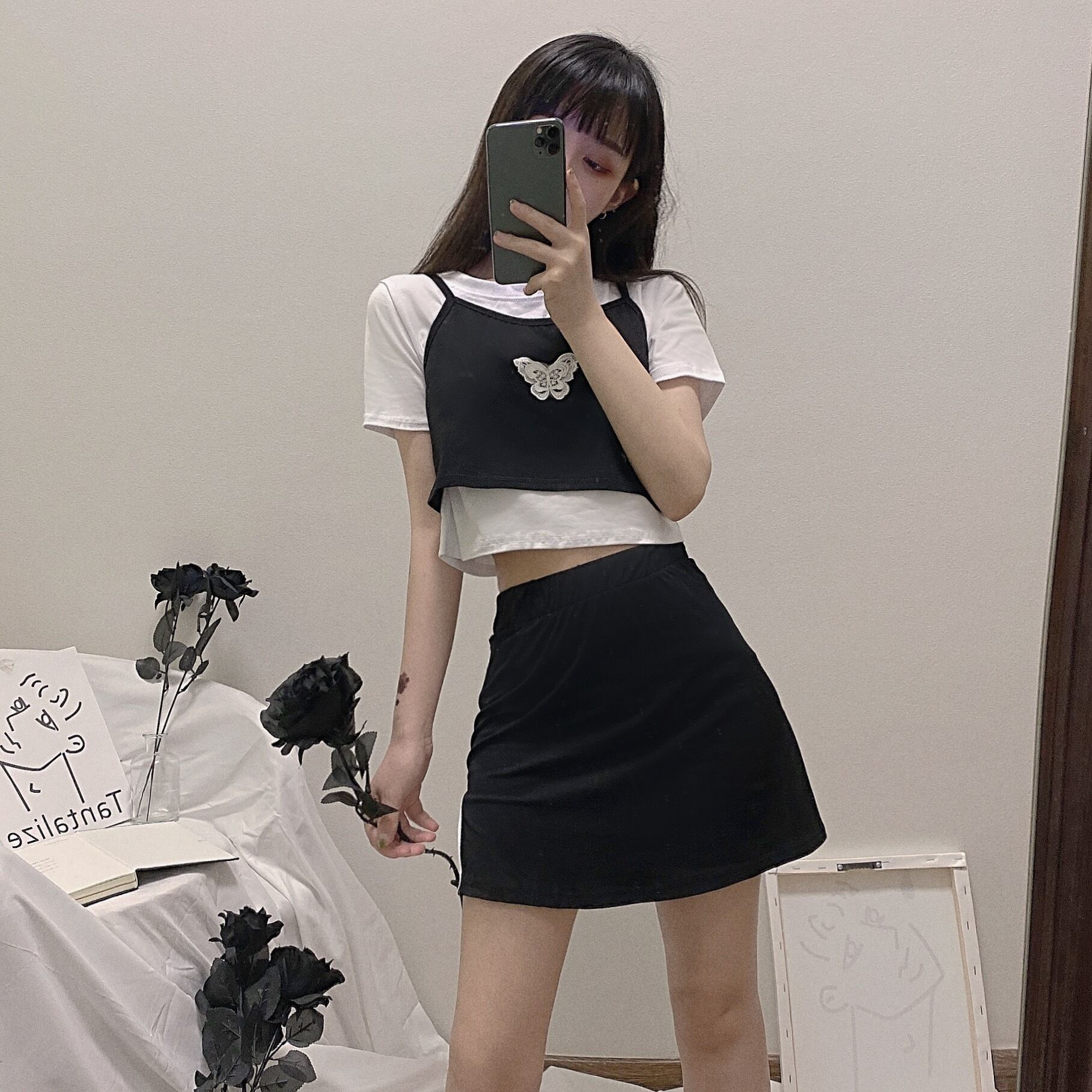 色:ブラックとホワイトのフェイクツーピーストップ,ブラックスカートワンピース