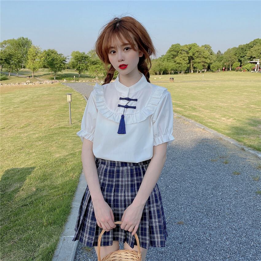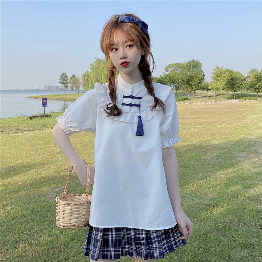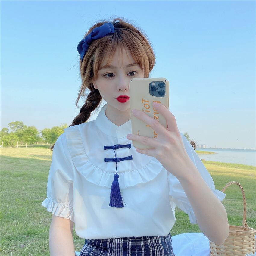✞ スタンドカラーバックル半袖スリーブソリッド カラー白シャツブラウス ショート ホワイト ソリッドカラー ステッチ ✞ゴスロリ SM ミリ 甘ロリ クラロリ 和ロリ エレガント 黒ロリ 姫ロリ 華ロリ BB-BB9194271