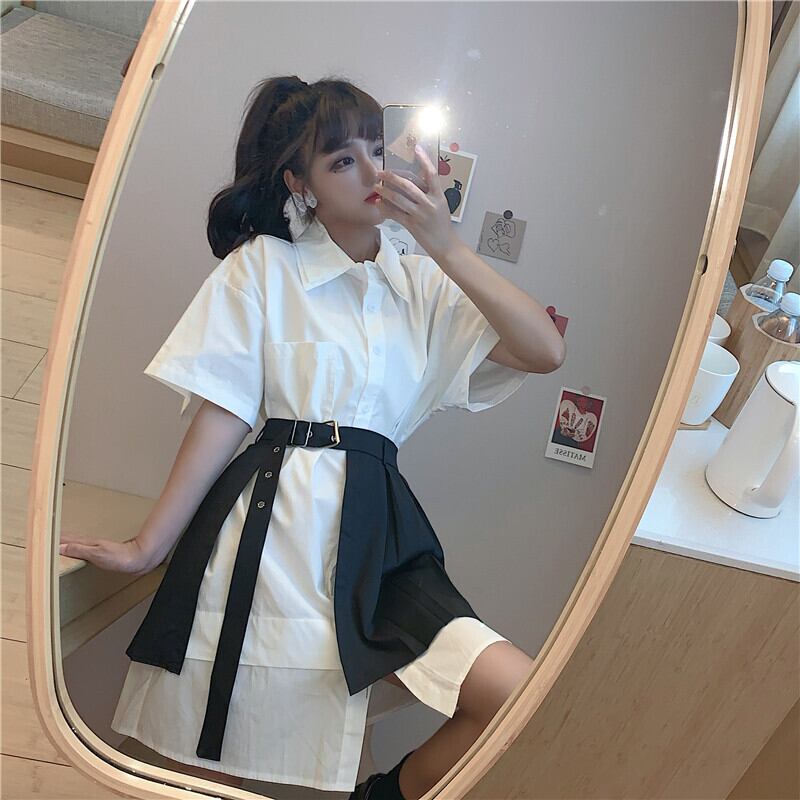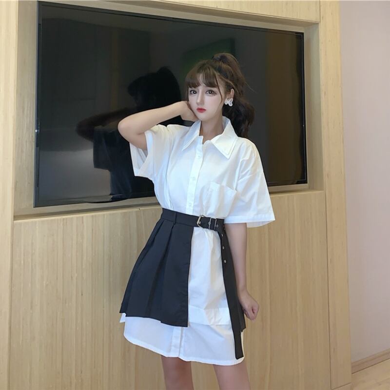 色:白いシャツワンピース,ブラックプリーツスカートワンピース