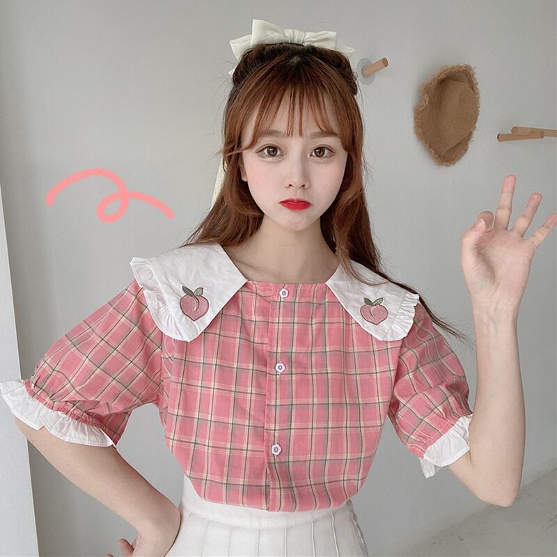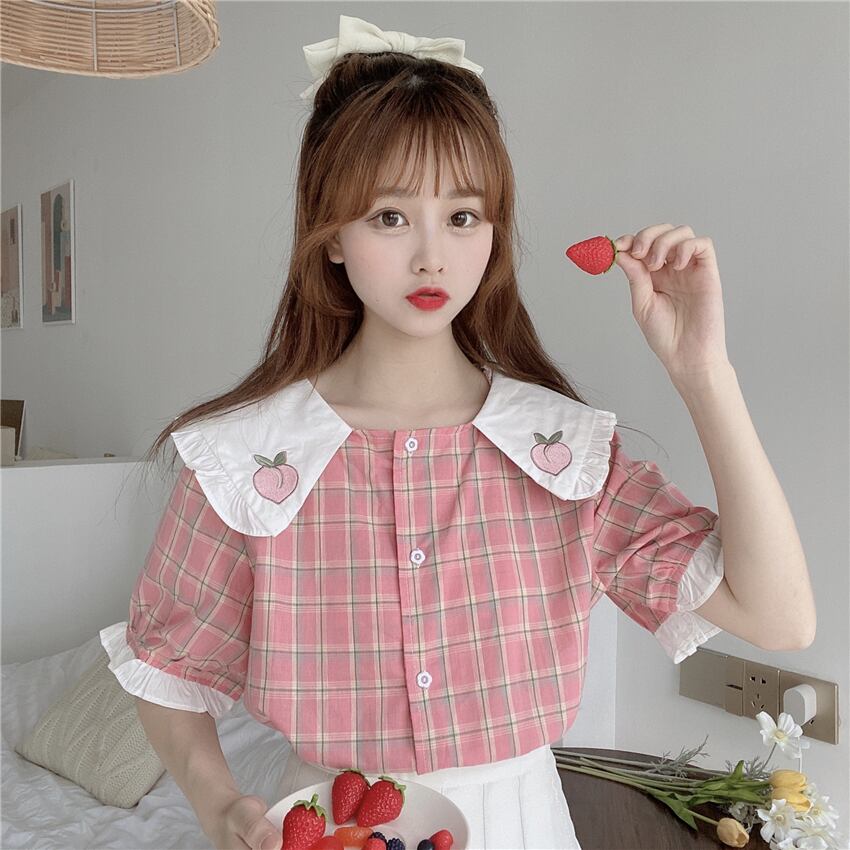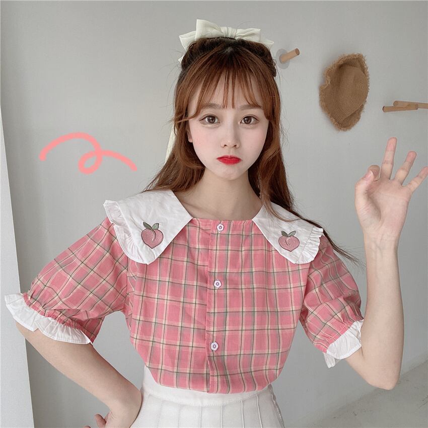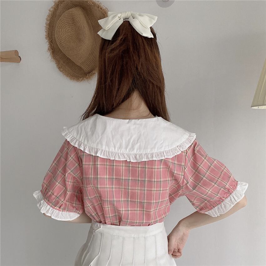 ✞ シャツブラウスチェック柄半袖スリーブトップス ♥カワイイ♥ ショート ピンク スウィート ガーリー ✞ゴスロリ SM ミリ 甘ロリ クラロリ 和ロリ エレガント 黒ロリ 姫ロリ 華ロリ BB-BB9755620