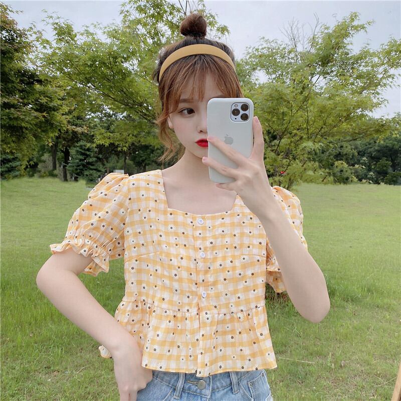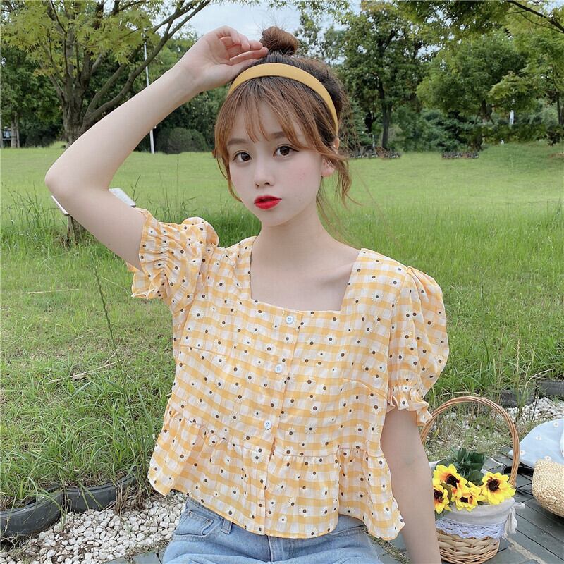 ✞ 花柄ショートシャツブラウスイエローチェック柄♥カワイイ♥ スウィート スクウェア ✞ゴスロリ SM ミリ 甘ロリ クラロリ 和ロリ エレガント 黒ロリ 姫ロリ 華ロリ BB-BB9730020