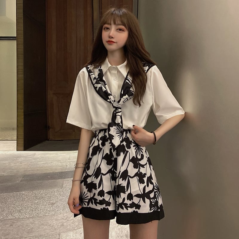 ✞ スカーフ シャツブラウスストレッチスタンダードプリントショートパンツ レトロ エラスティック 伸縮 ステッチ ✞ゴスロリ SM ミリ 甘ロリ クラロリ 和ロリ エレガント 黒ロリ 姫ロリ 華ロリ BB-BB4369347