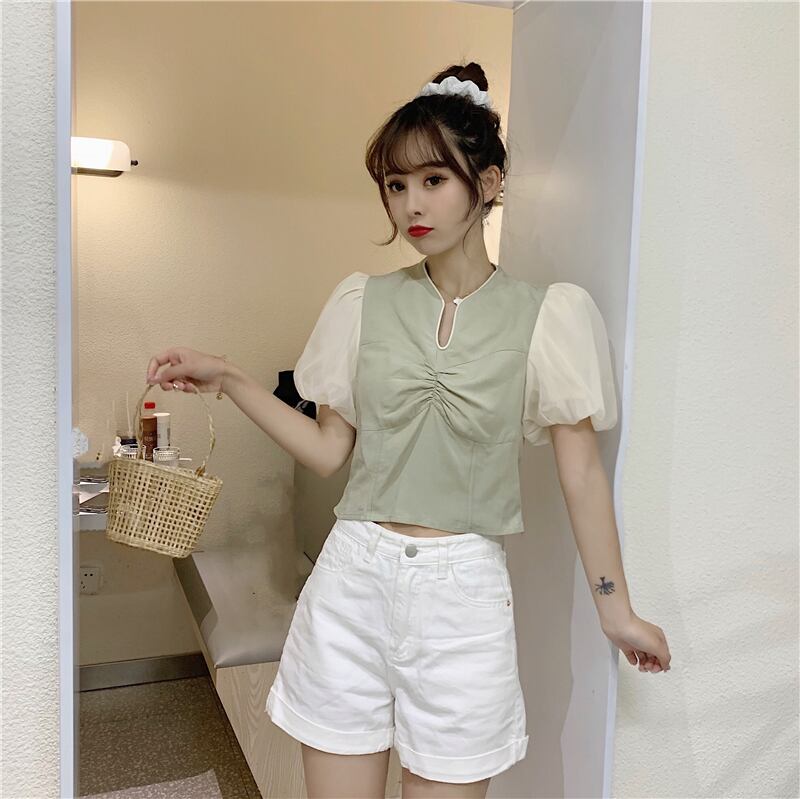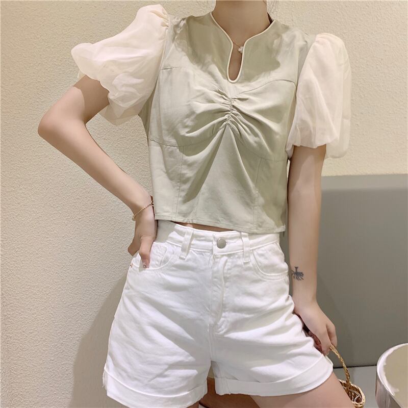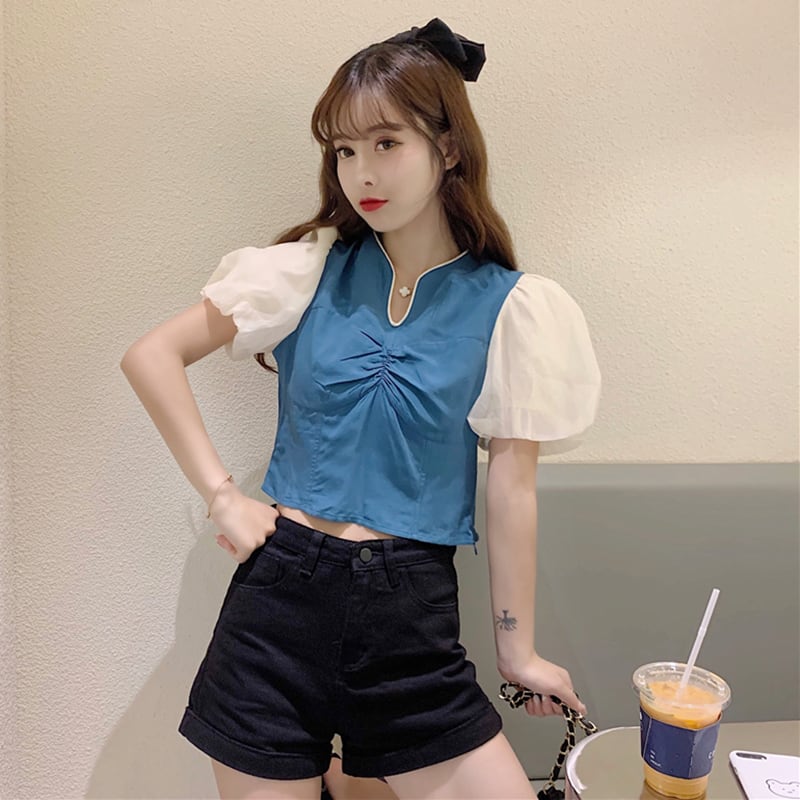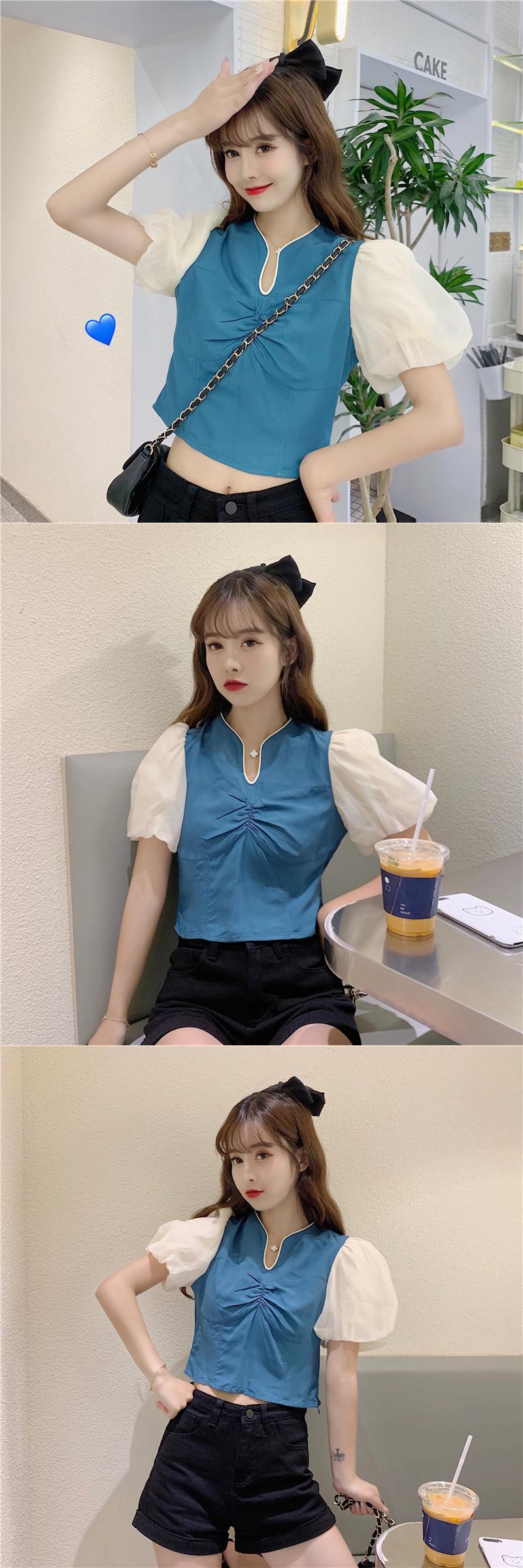 ✞ Vネックプリーツスリーブスリムカラー♥カワイイ♥ショートシャツブラウス ✞ゴスロリ SM ミリ 甘ロリ クラロリ 和ロリ エレガント 黒ロリ 姫ロリ 華ロリ BB-BB0737763