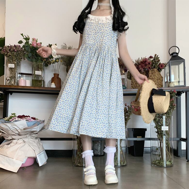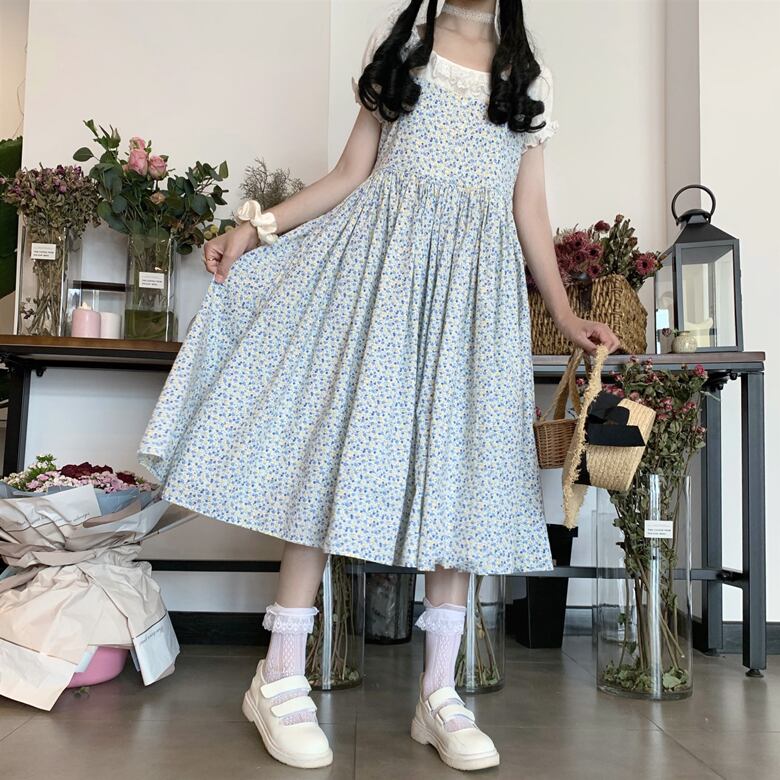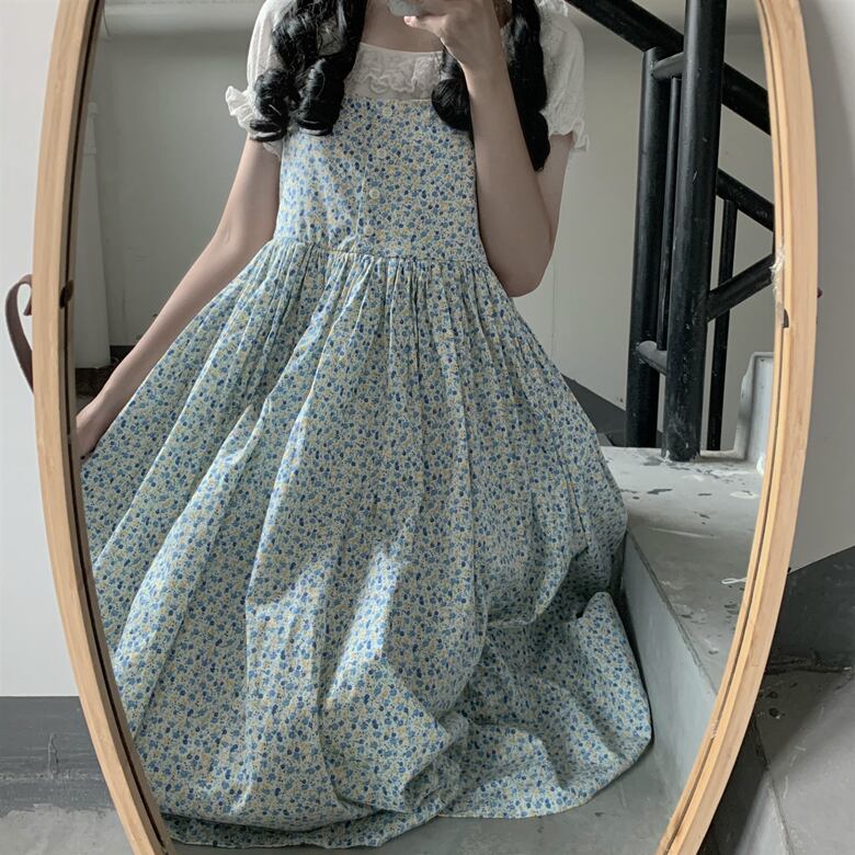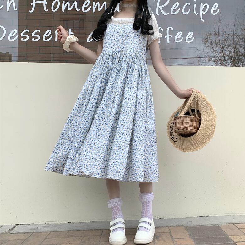 色:フローラルブルーサスペンダースカートシングルピース,ホワイトトップ