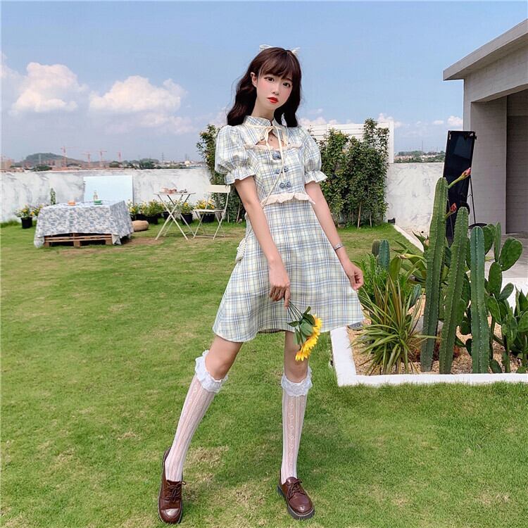 ✞ レーススリーブウエストすっきり☆着痩せスタンダードチェック柄ドレス ワンピースサマー レトロ スウィート 夏物 レースアップ ✞ゴスロリ SM ミリ 甘ロリ クラロリ 和ロリ エレガント 黒ロリ 姫ロリ 華ロリ BB-BB0849251