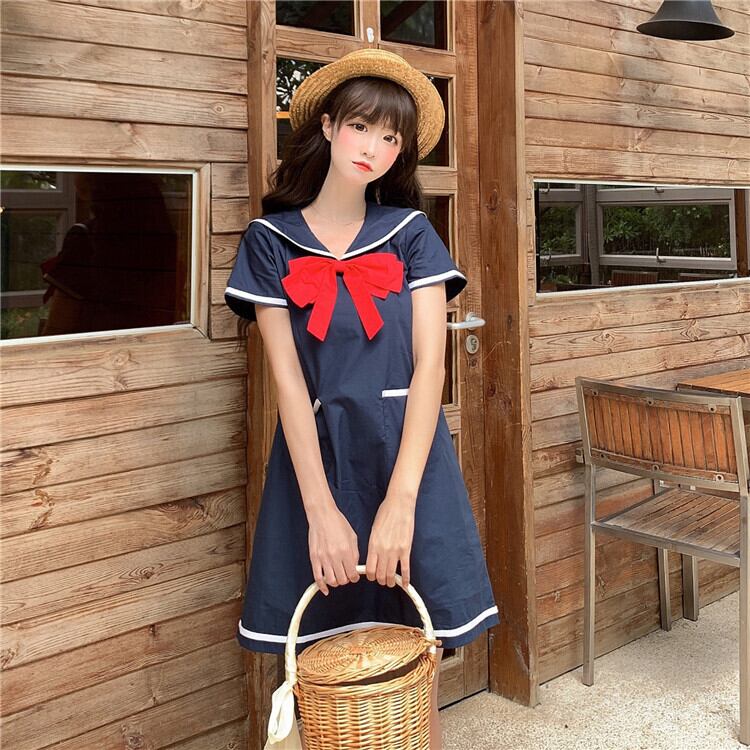 ✞ 体型カバーOK☆りぼん半袖スリーブポケットワンピース♥カワイイ♥ネイビー ショート リボン スウィート ステッチ ✞ゴスロリ SM ミリ 甘ロリ クラロリ 和ロリ エレガント 黒ロリ 姫ロリ 華ロリ BB-BB0615122