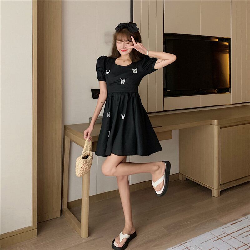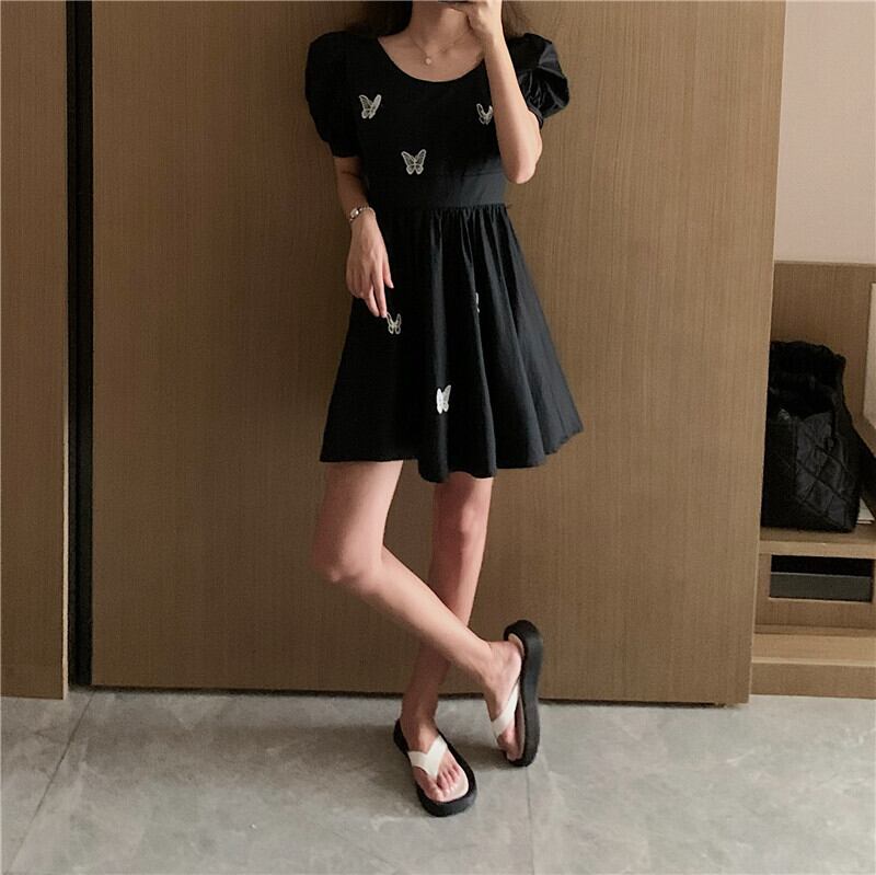 ✞ ダークスタンダードラウンドネックButterflyデザイン プリーツスリーブウエストすっきり☆着痩せきれいめ☆ レトロ ステッチ ✞ゴスロリ SM ミリ 甘ロリ クラロリ 和ロリ エレガント 黒ロリ 姫ロリ 華ロリ BB-BB9053915