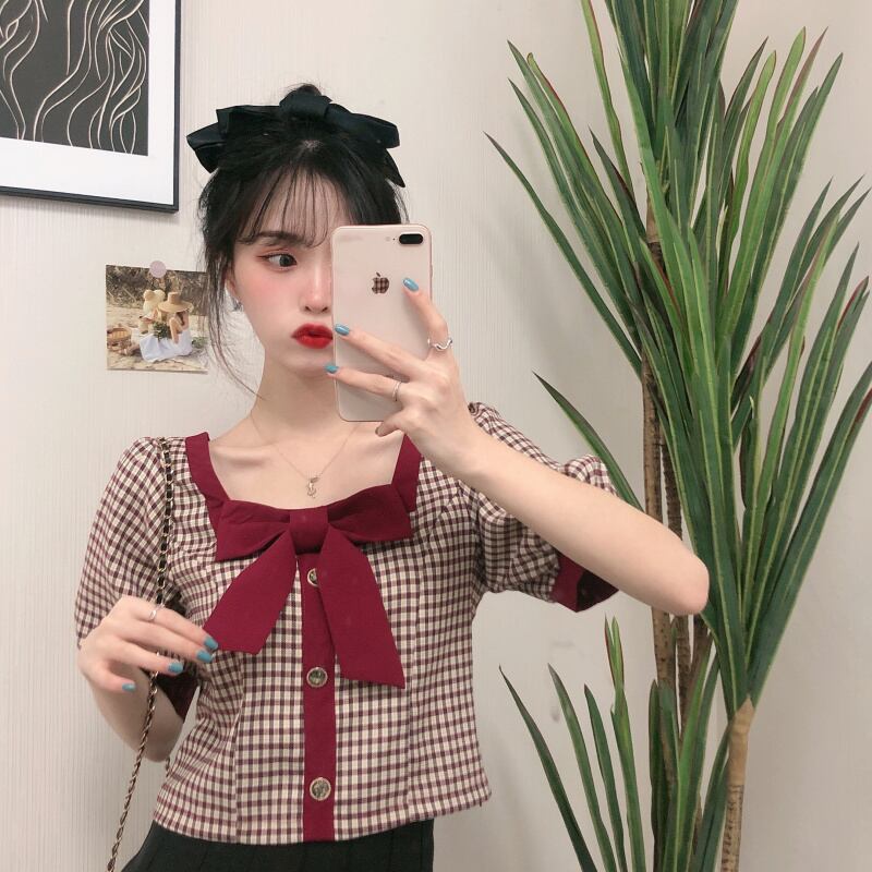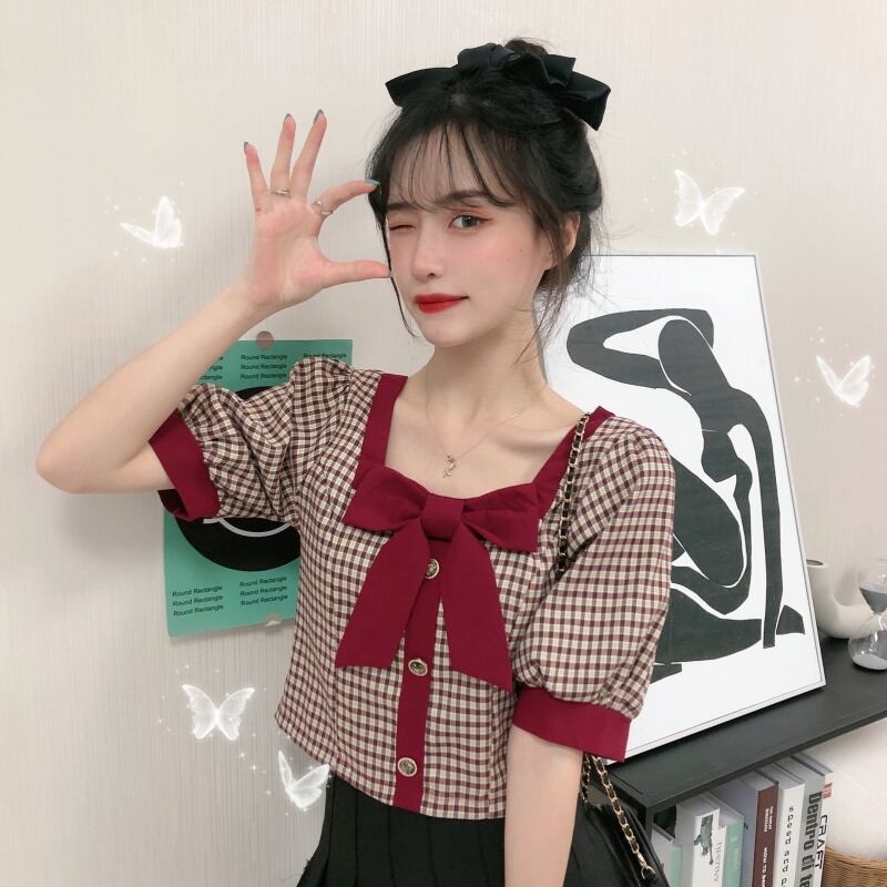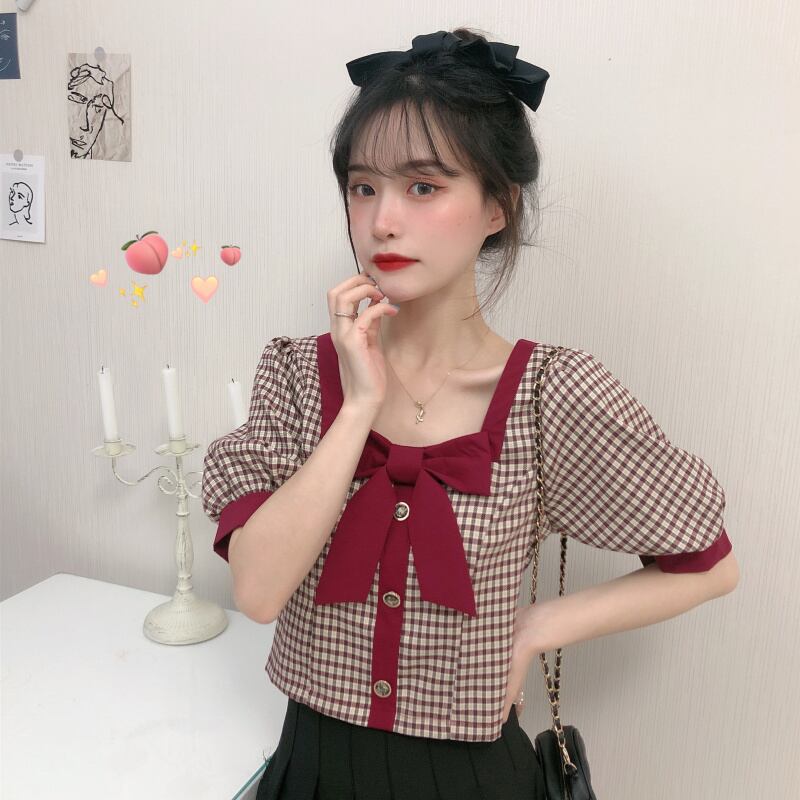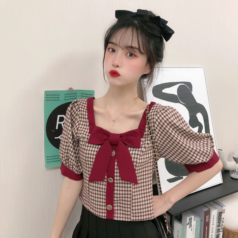 ✞ リボンチェック柄スクウェアネックスリーブシャツブラウス ショートプルオーバー レトロ スウィート ステッチ ✞ゴスロリ SM ミリ 甘ロリ クラロリ 和ロリ エレガント 黒ロリ 姫ロリ 華ロリ BB-BB6249332