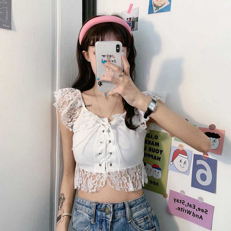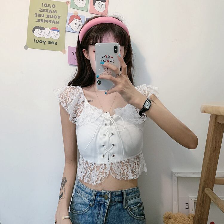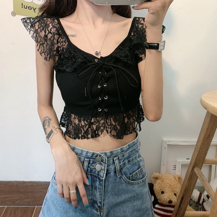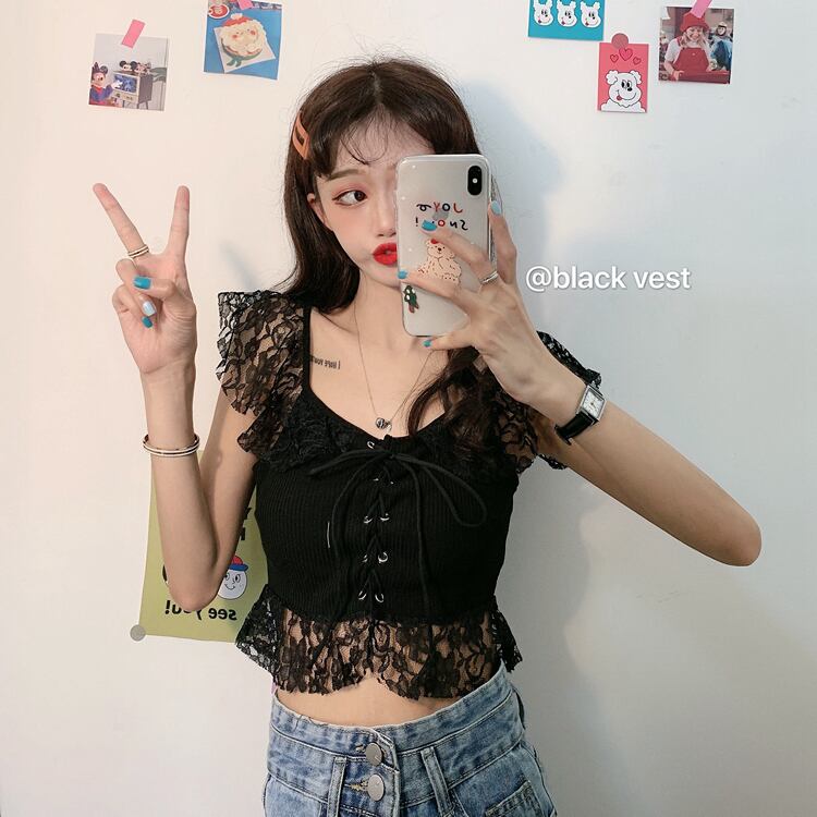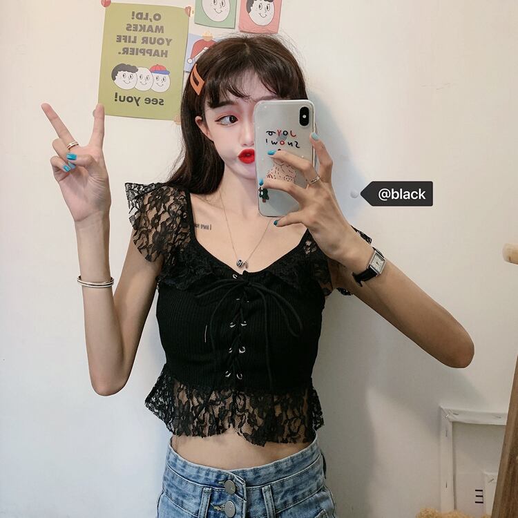 ✞ 肩&裾レースがガーリー❤ノースリーブスリムショート丈シャツブラウス クロスストラップ キャミソール ステッチ ✞ゴスロリ SM ミリ 甘ロリ クラロリ 和ロリ エレガント 黒ロリ 姫ロリ 華ロリ BB-BB8102843