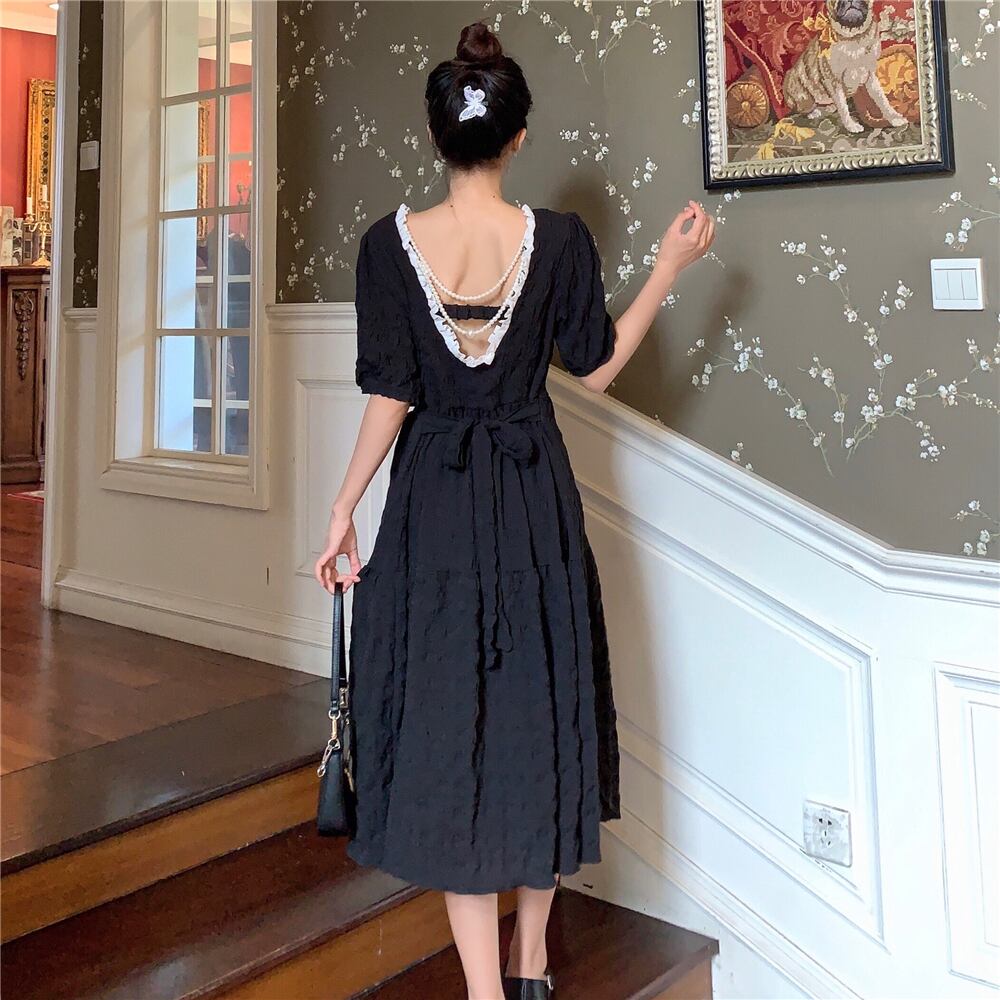 ✞ スタンダードプリーツスリーブバックレスウエストすっきり☆着痩せレース レトロ スクウェア ステッチ ✞ゴスロリ SM ミリ 甘ロリ クラロリ 和ロリ エレガント 黒ロリ 姫ロリ 華ロリ BB-BB0384162