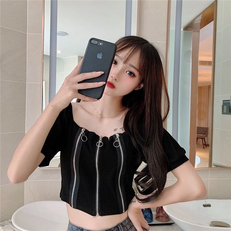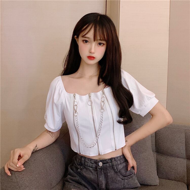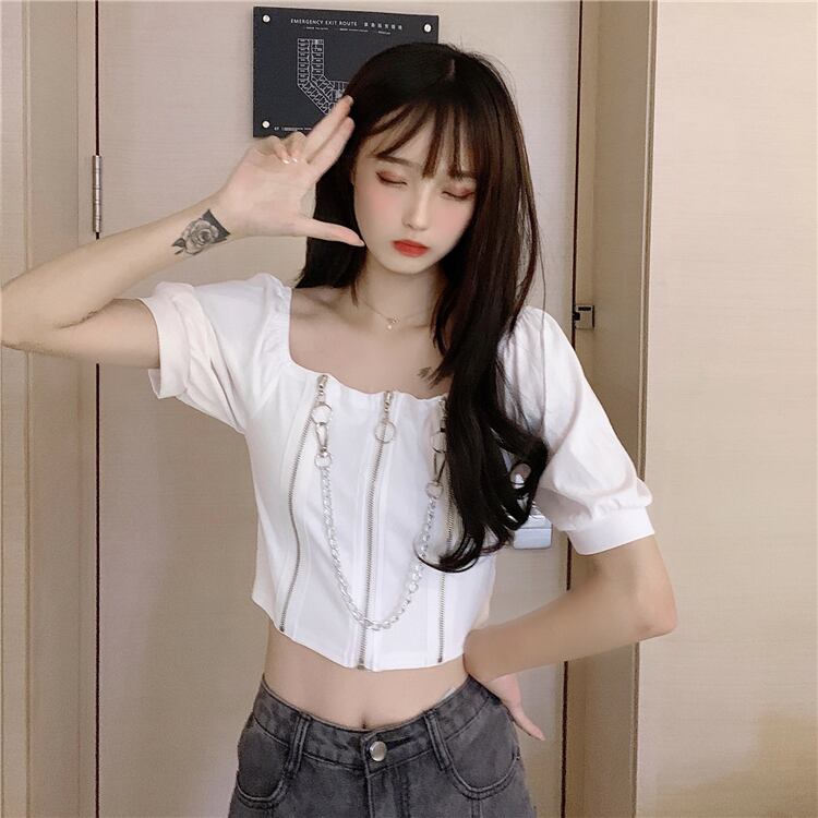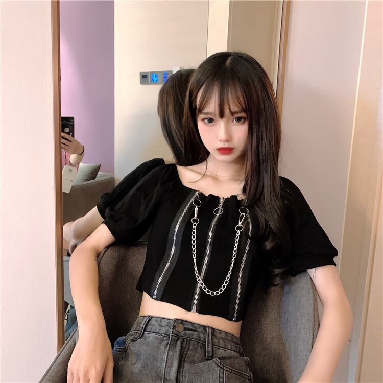 ✞ Tシャツ チェーン ジッパーショートスリムトップス スクウェア ステッチ ✞ゴスロリ SM ミリ 甘ロリ クラロリ 和ロリ エレガント 黒ロリ 姫ロリ 華ロリ BB-BB9827216