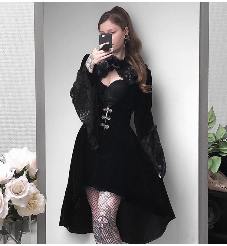 ✞ダークネスベルベットレース姫スリーブワンピースOP♥スカート ロング レトロ ✞✝✞ ゴスロリ SM ミリ 甘ロリ クラロリ 和ロリ エレガント 黒ロリ 姫ロリ 華ロリ AA-AA7705602