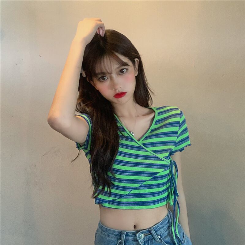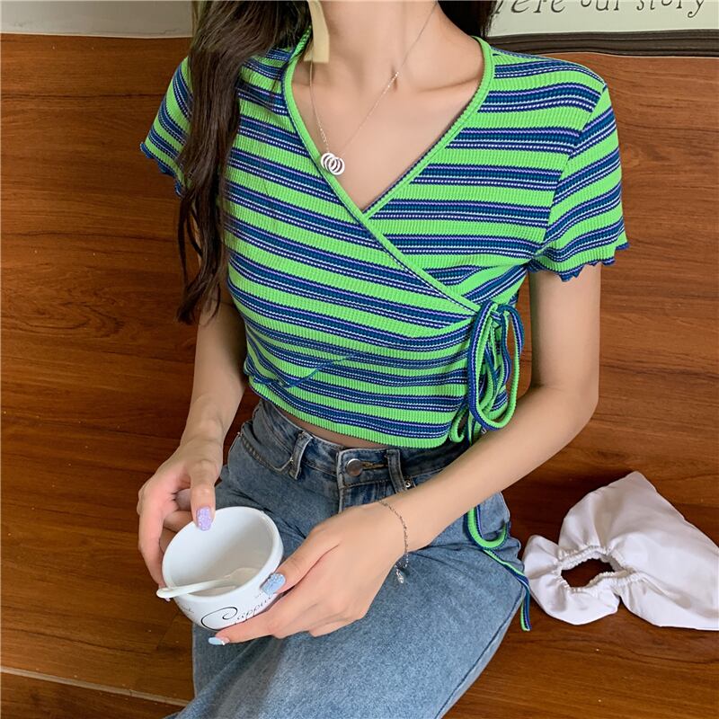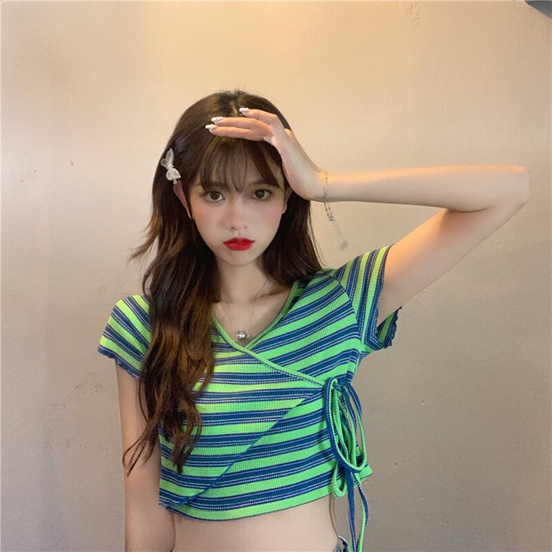 ✞ ブルーxグリーンボーダー ストライプTシャツ ストラップ ♥カワイイ♥ショートVネックトップス レトロ ✞ゴスロリ SM ミリ 甘ロリ クラロリ 和ロリ エレガント 黒ロリ 姫ロリ 華ロリ BB-BB0078685